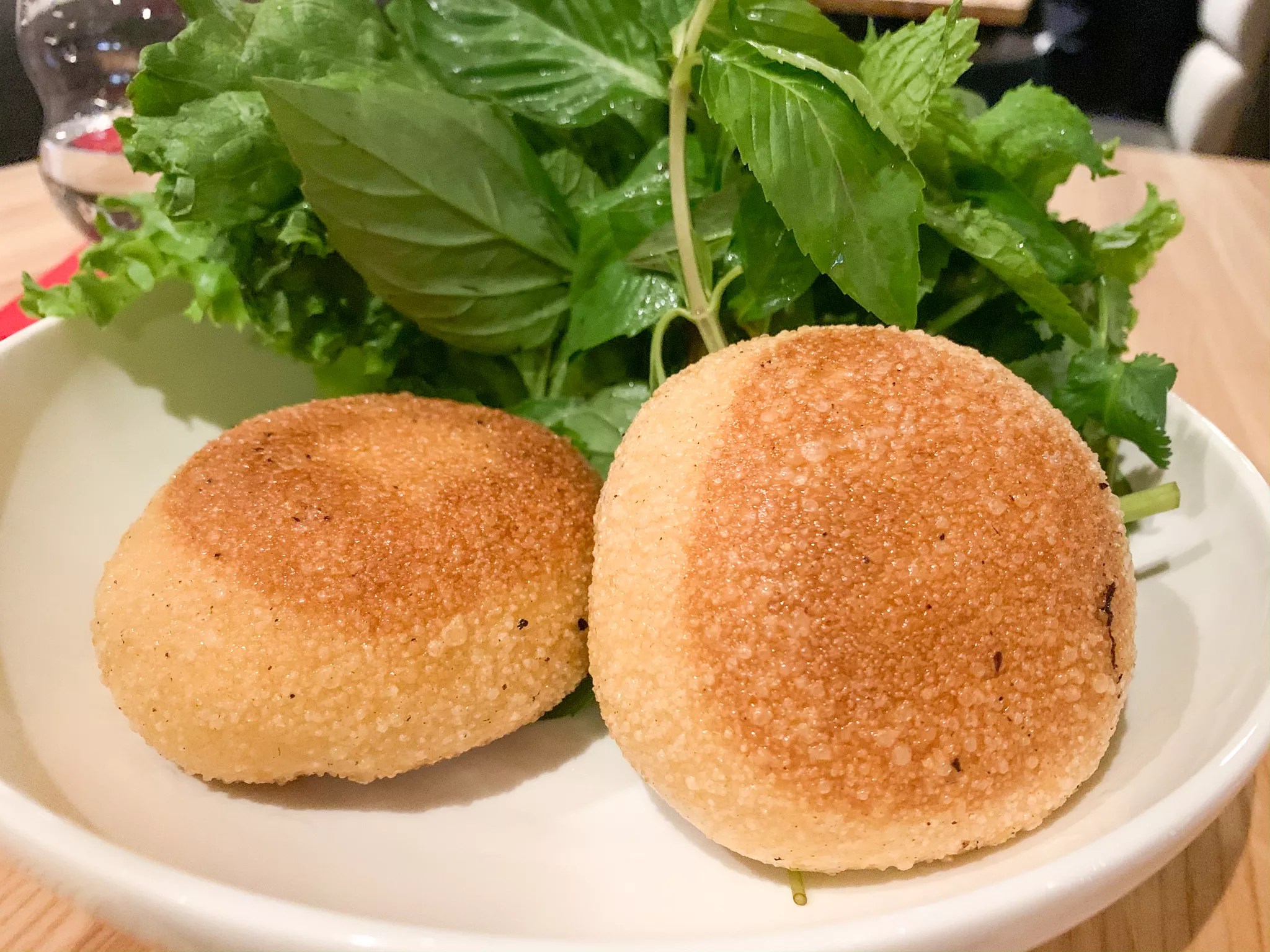 The two banh bao buns are filled with the five-spice brisket, Vietnamese kimchi and onions ($17). They’re steamed then pan-fried in leek to get that crispy exterior that so wonderfully melts the whipped kimchi butter you swipe on top of it. (Can we get a cup of that butter to go, chef?) Another plethora of herbs comes with this. There’s no wrong way to go about it. Open up the bun, stuff them in; tear off a bite and wrap it in herbs; do whatever you need to do to complement the savory bun with the bright herbs and experience the flavors together.