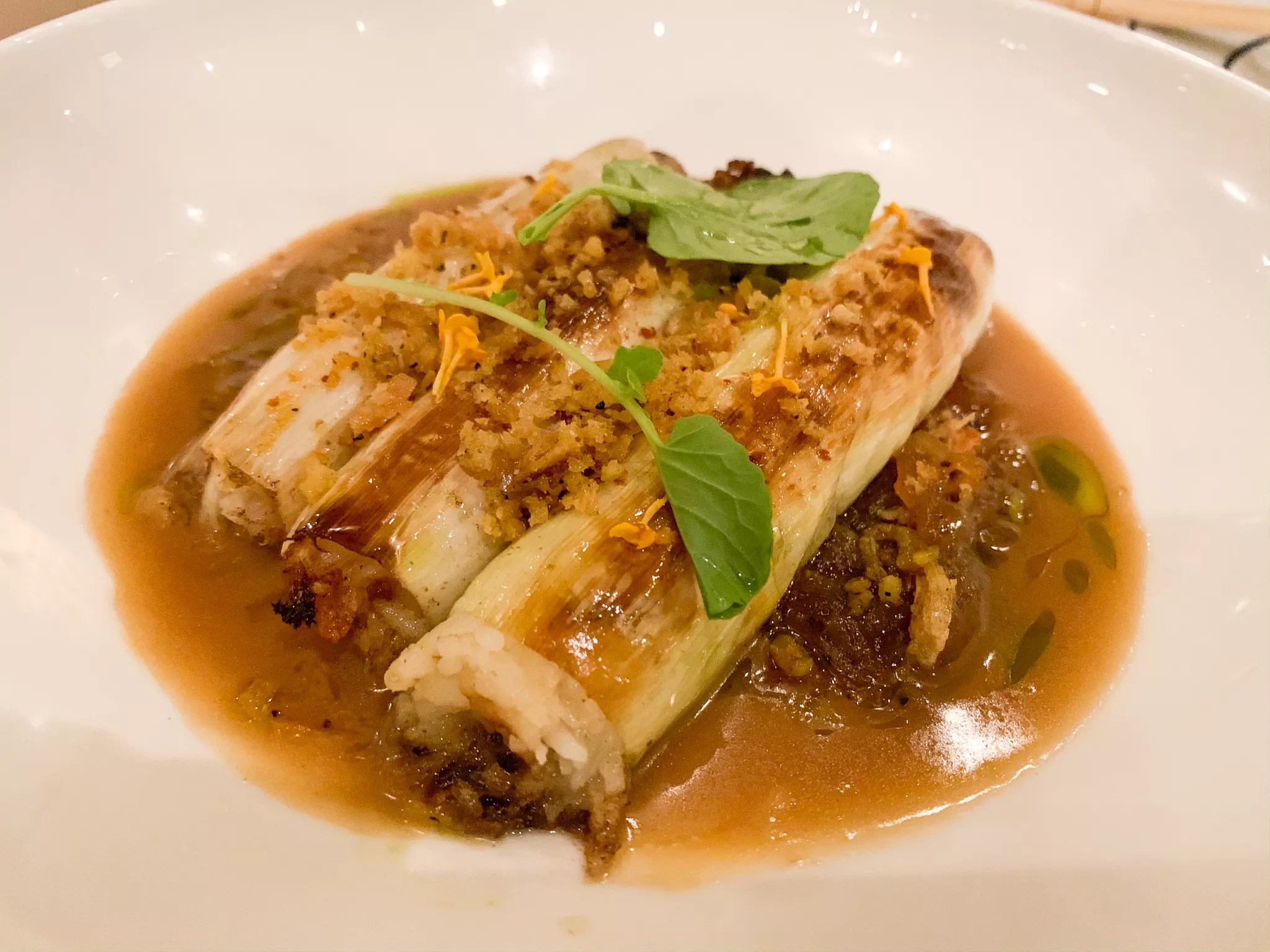 This dish had the best flavors of the night for our table: Three leeks are filled with Louisiana blue crab, jasmine rice and ginger and baked. The savory cylinders sit on top of an incredible smoked fish bone fume and onion marmalade. It’s not the easiest plate to consume: cutting into the leeks, or biting into them, is difficult, as the vegetable doesn’t want to break and tears off in strands. However, the awkwardness is worth it. A next visit may entail just mixing it all together because that onion marmalade paired with the sweet crab and complemented perfectly well with the texture of rice is something we will never stop craving.