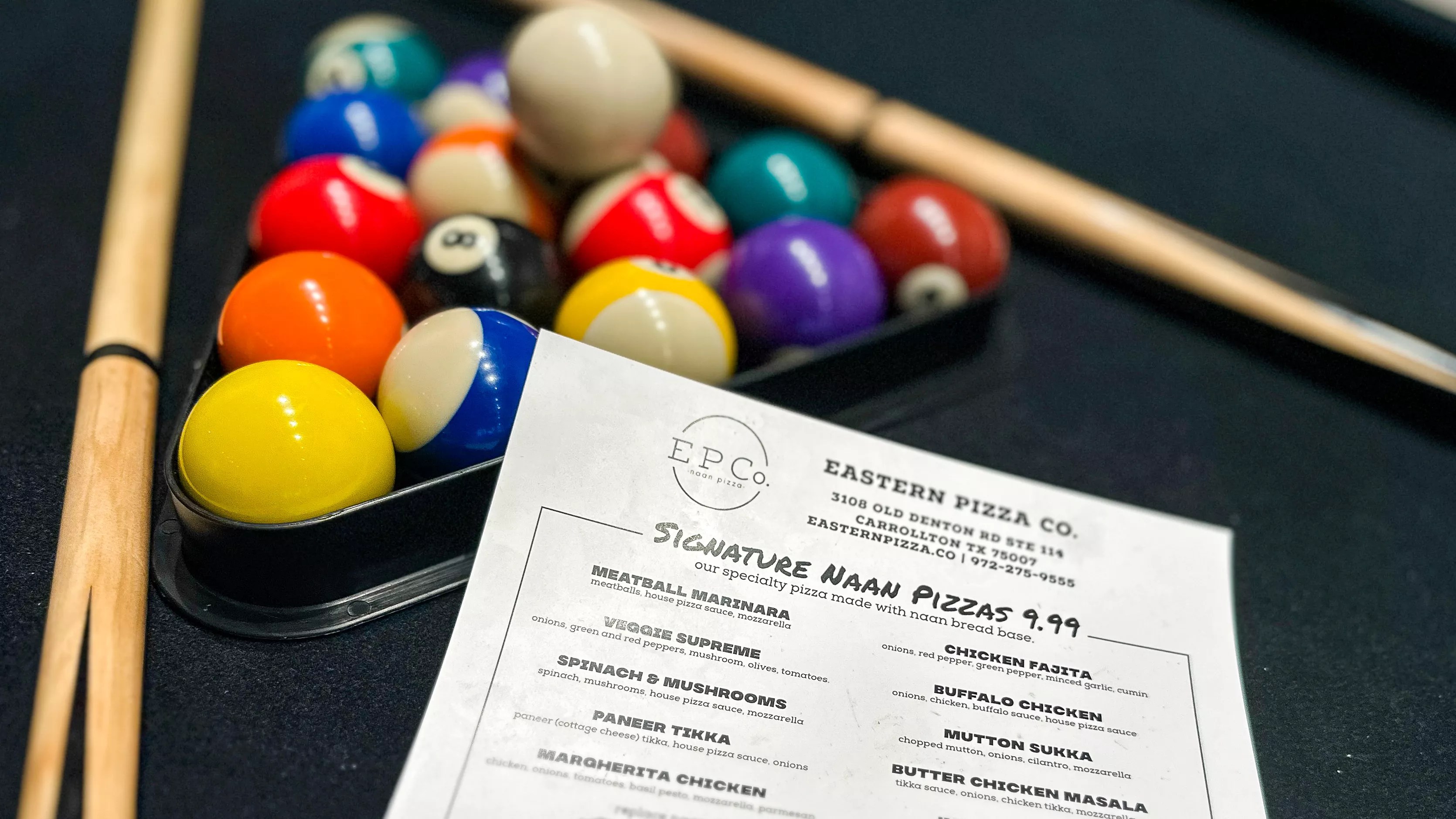 When you enter, you’ll immediately realize something: Eastern Pizza Co is more than a restaurant. It’s a mini pool hall with four tables that are free to use while you’re dining. Who doesn’t enjoy a rousing game of nine ball whilst nibbling on some samosas and waiting for your mutton sukka naan pizza to be prepared? Chalk one up for the Eastern Pizza Co.