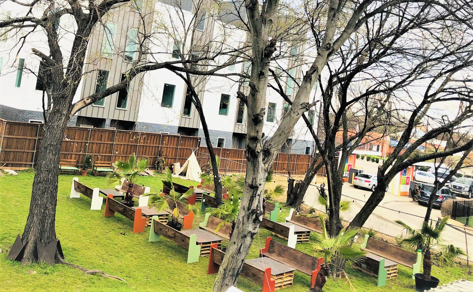 The spacious courtyard has eight large tables, which are wooden crate stacks topped with plywood. Church pews that were rescued from a church in East Dallas that was being demolished provide seating, with hymnal boxes still intact (could probably slide your beer in there, you sinner). Tall trees arch over the tables, which should provide nice shade soon.