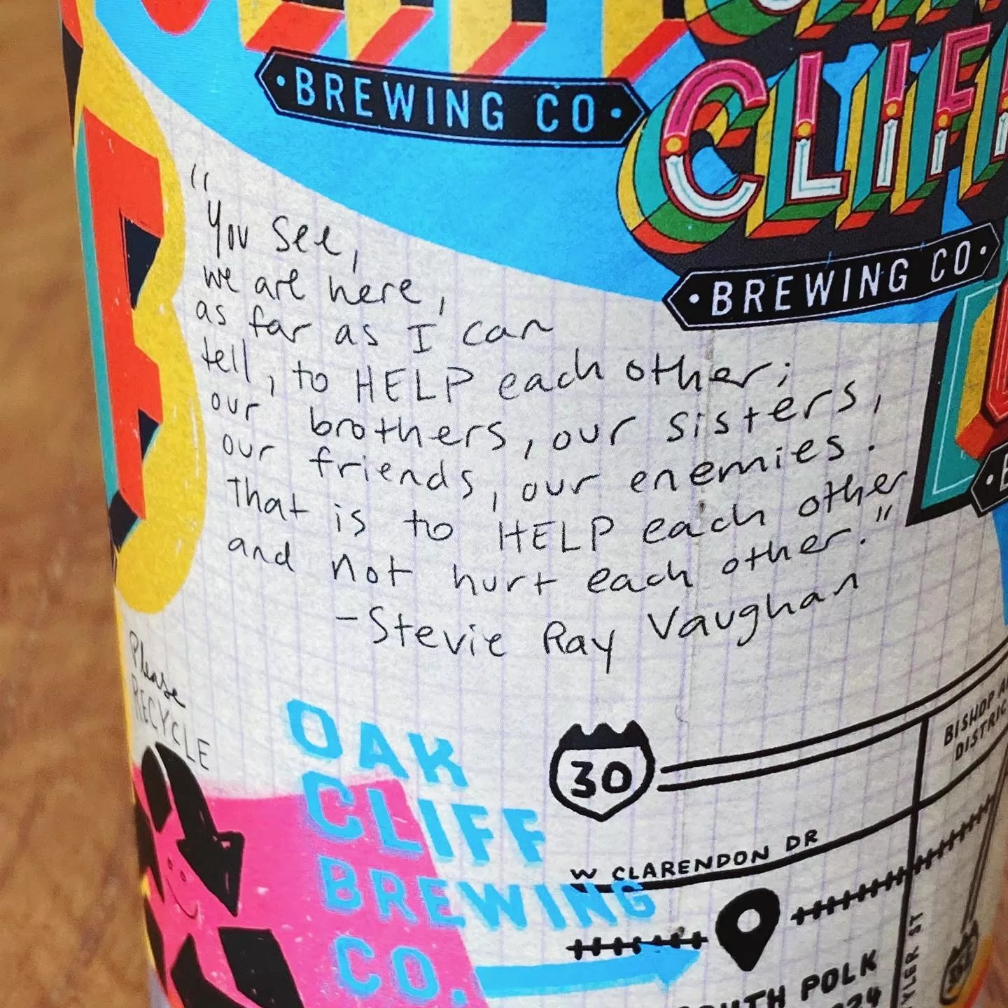 Oak Cliff Brewing Co. wins the contest for best label, hands down. Before all this started they were working on the design and had some space for text and settled on this prophetic quote from Oak Cliff’s very own Stevie Ray Vaughan: