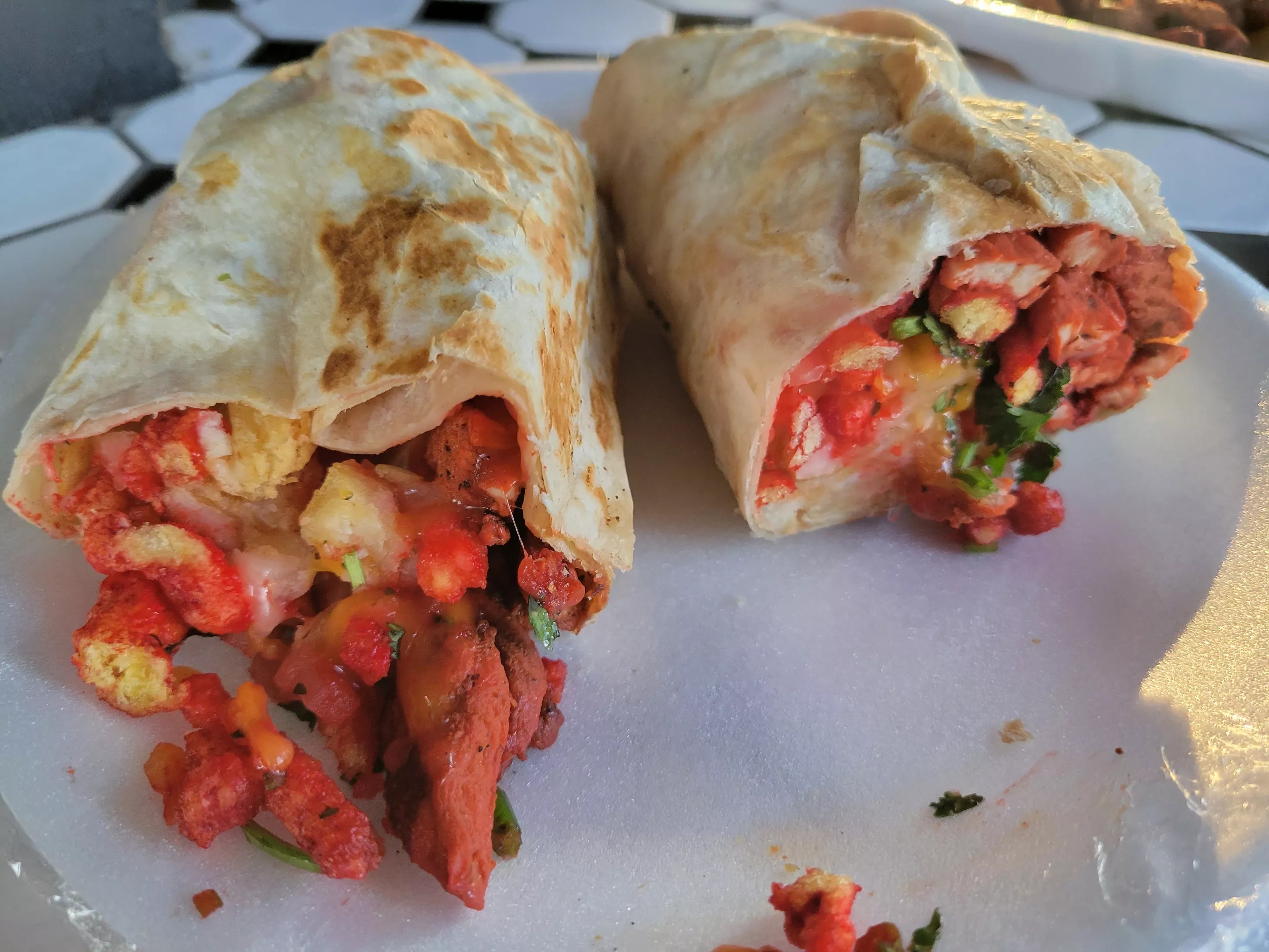 The LA-style burrito filled with Flamin’ Hot Cheetos at Tacos La Gloria.