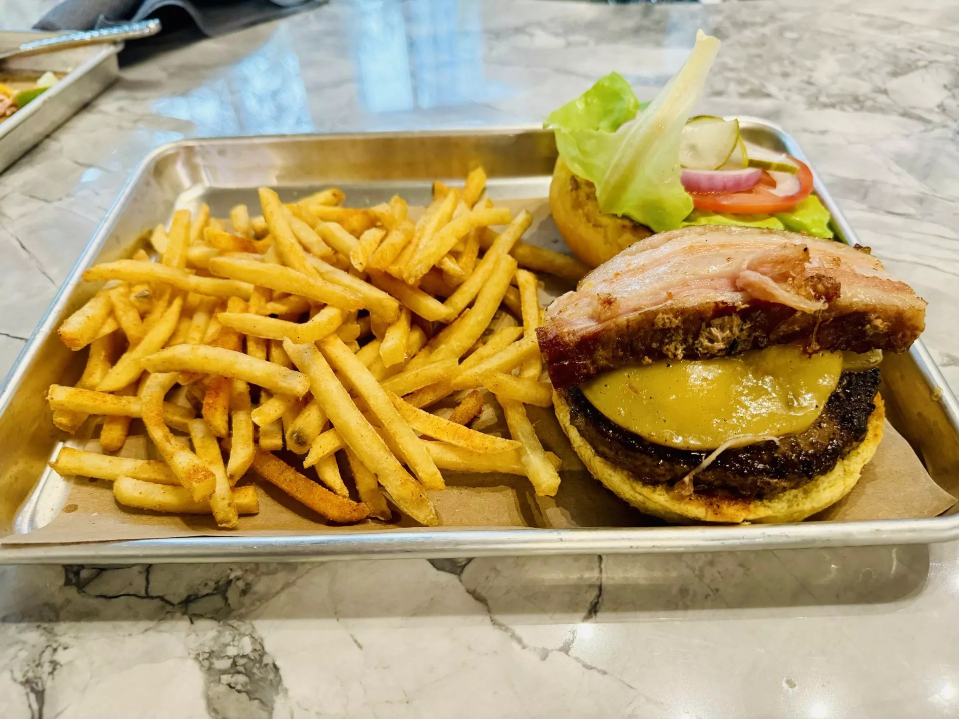 Victory Grill’s “The Social” hamburger. On top lies the thickest, most divine hunk of bacon we’ve ever come across in a burger. Nick Reynolds