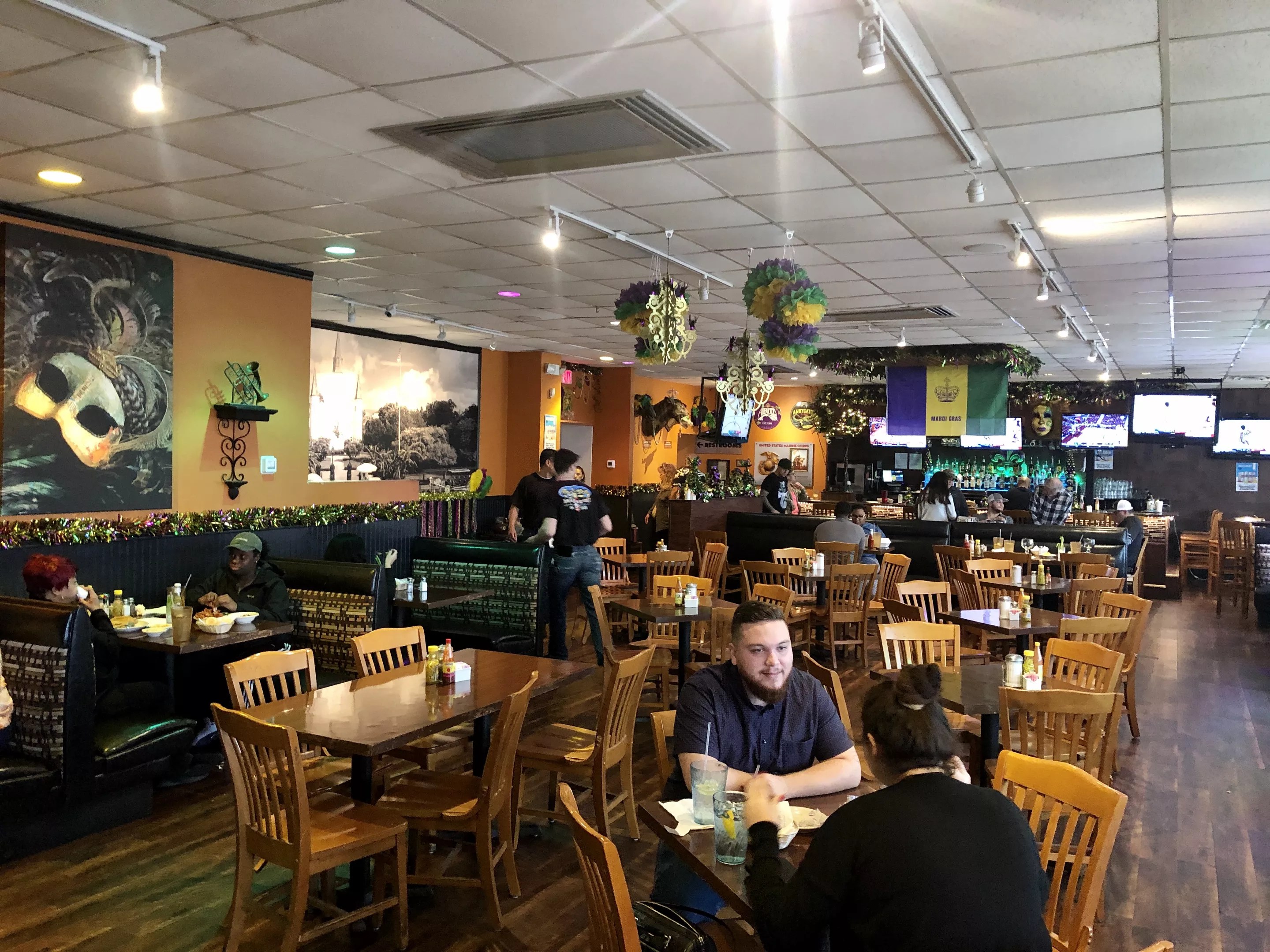 The restaurant, at West Walnut Hill Lane and North Belt Line Road, is located in an unassuming strip mall, next to an urgent care clinic and salon. Inside, the space is decorated with ubiquitous New Orleans imagery: St. Louis Cathedral, jazz players and Mardi Gras masks.