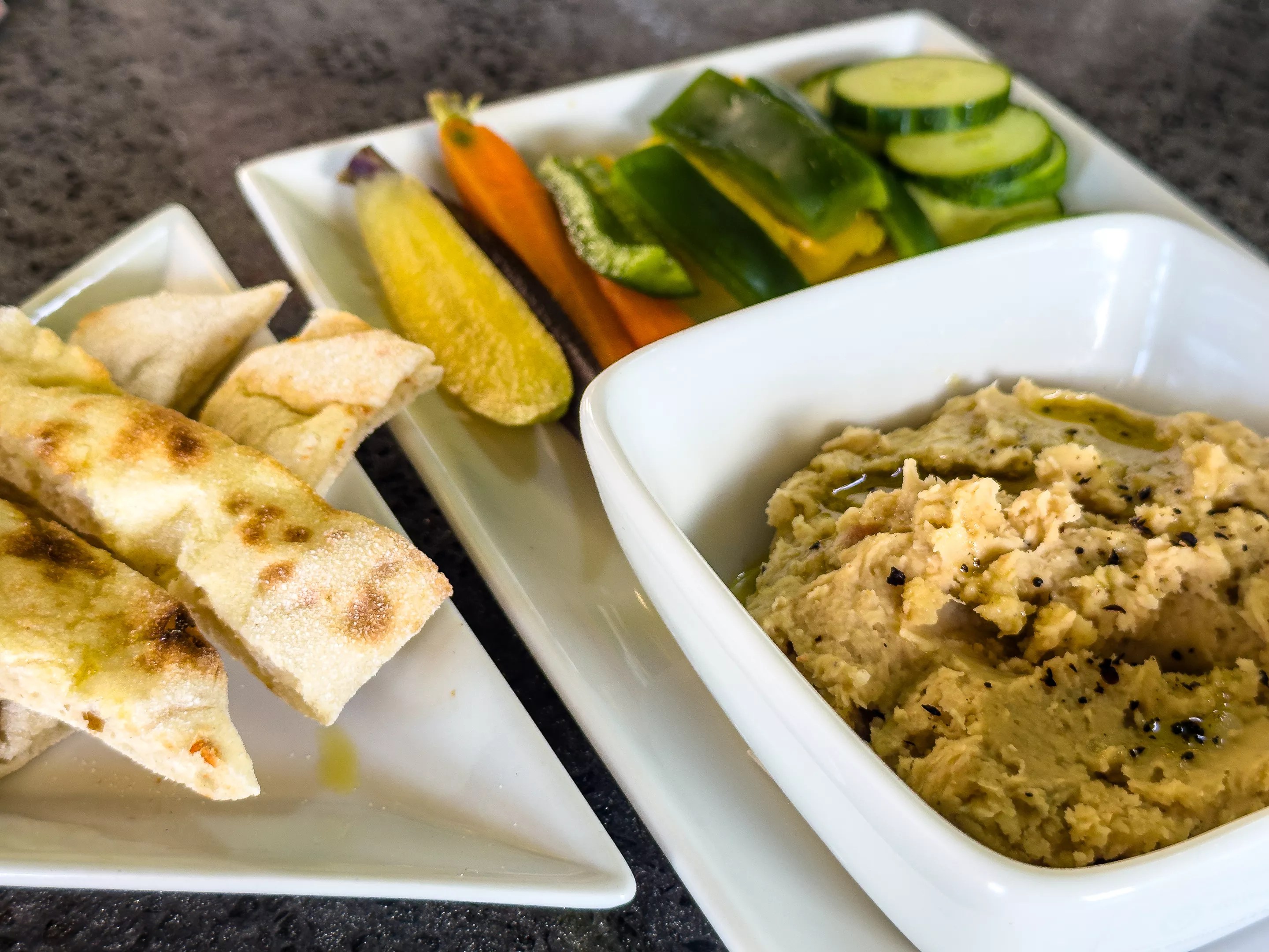 The hummus was a bit different in that it used cannellini beans as the base instead of chickpeas, which made it less viscous and a bit heartier. It came with a generous supply of veggies for dipping, and we added some blistered flatbread.