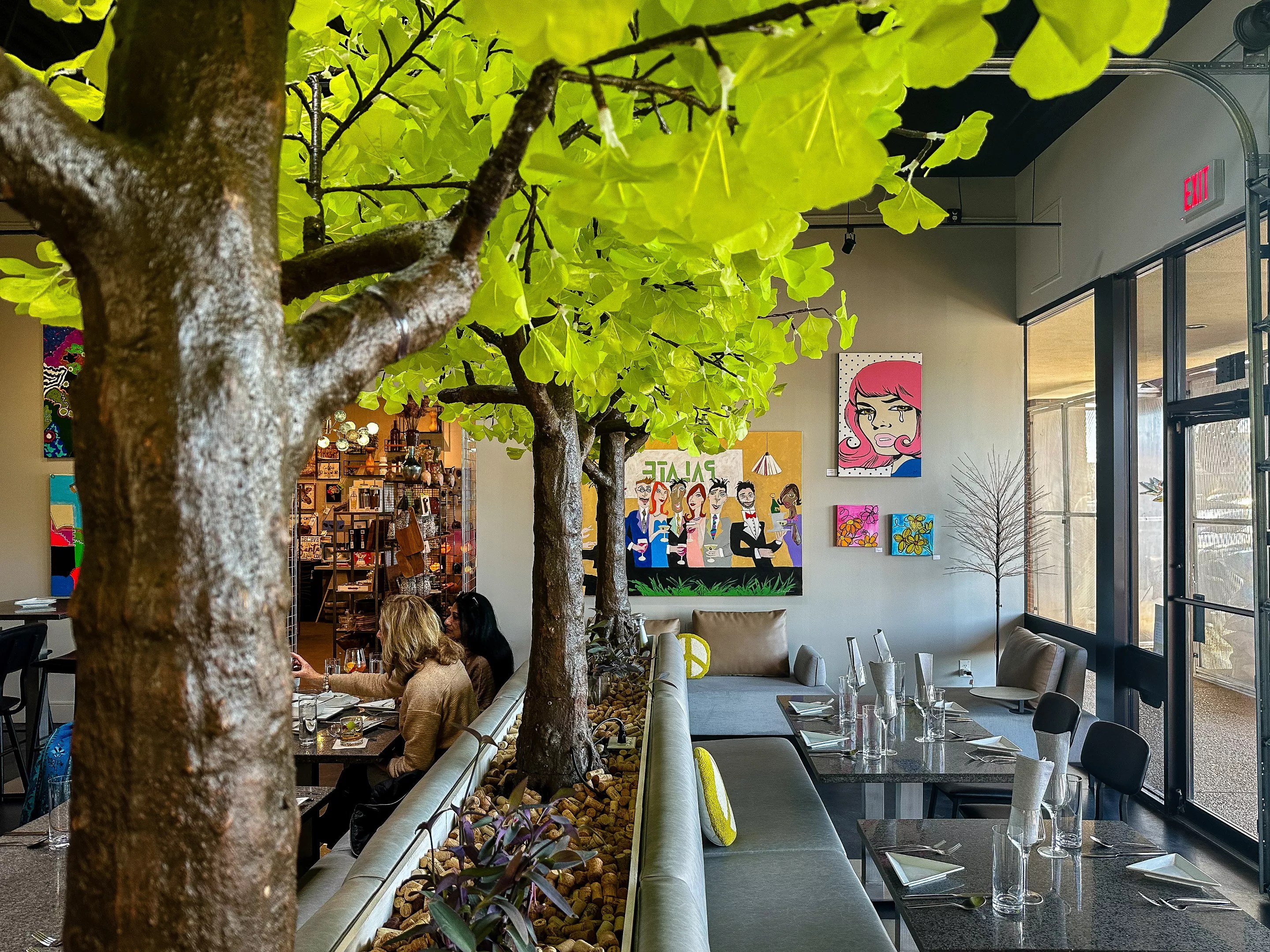 Tom Burt and Chrisopher White, owners of Lekka Retail Concepts, a little gift and home décor shop on Preston Road in North Dallas, recently opened their take on a wine bar and bistro that’s connected to the retail space. Christened Palate, the double meaning of which could apply to both taste and artistic harmony, the spot opened earlier this month offering bites and sips and we were eager to check it out. Ginkgo trees and local art create a warm and inviting color palate that complements the flavor palate expressed by the cuisine. Hank Vaughn