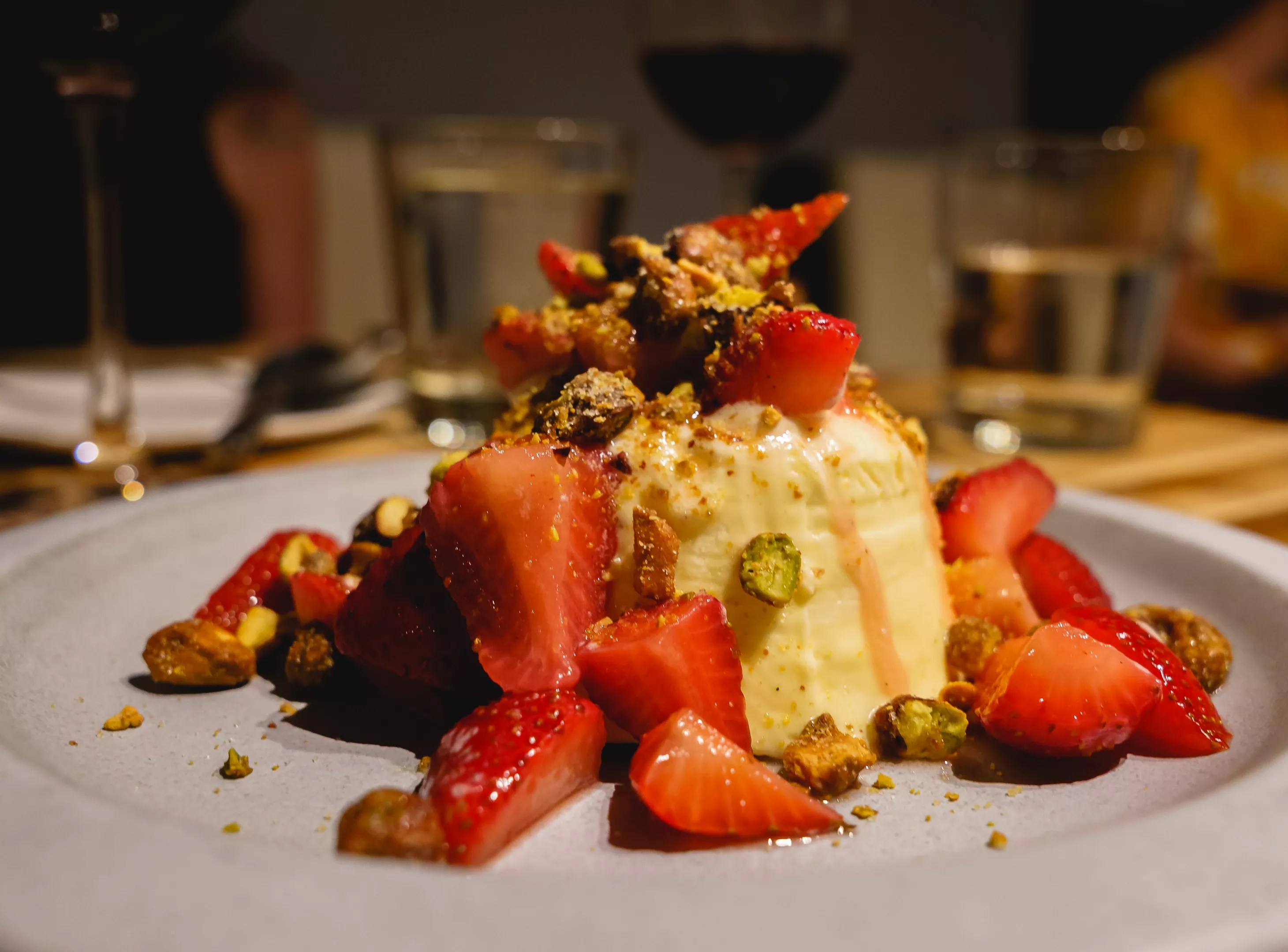 Four desserts round out the menu, including a chocolate budino, plum crostata, vanilla bean semifreddo with strawberries and candied pistachio, and, lastly, affogato – fresh espresso over semifreddo.