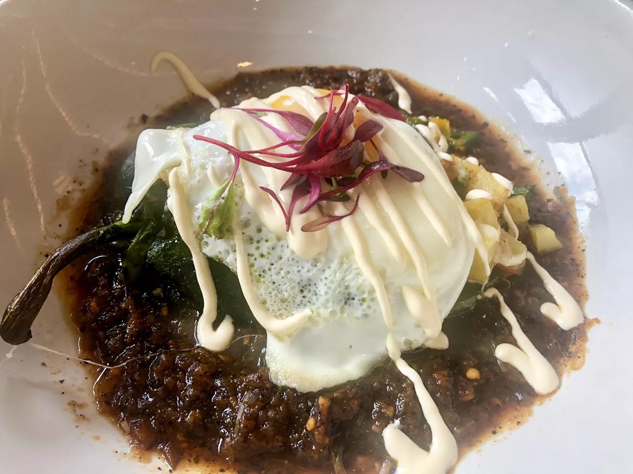 Now, Homewood doesn’t need any hype from me, but what people do need to know about is Choron sauce. It comes on the ham and cheese waffle, a savory take on this breakfast standard ($17). We see the price tag has increased by $2 since we were last there, but I stand by this waffle that has this velvety tomato sauce. The waffle has a proper balance of salt and is the perfect vehicle for the savory Choron that just gently leans a bit sweet. The whole thing is topped with dill and chives, and because just a touch of umami can’t hurt anything, it’s finished with a light dusting of nutritional yeast.