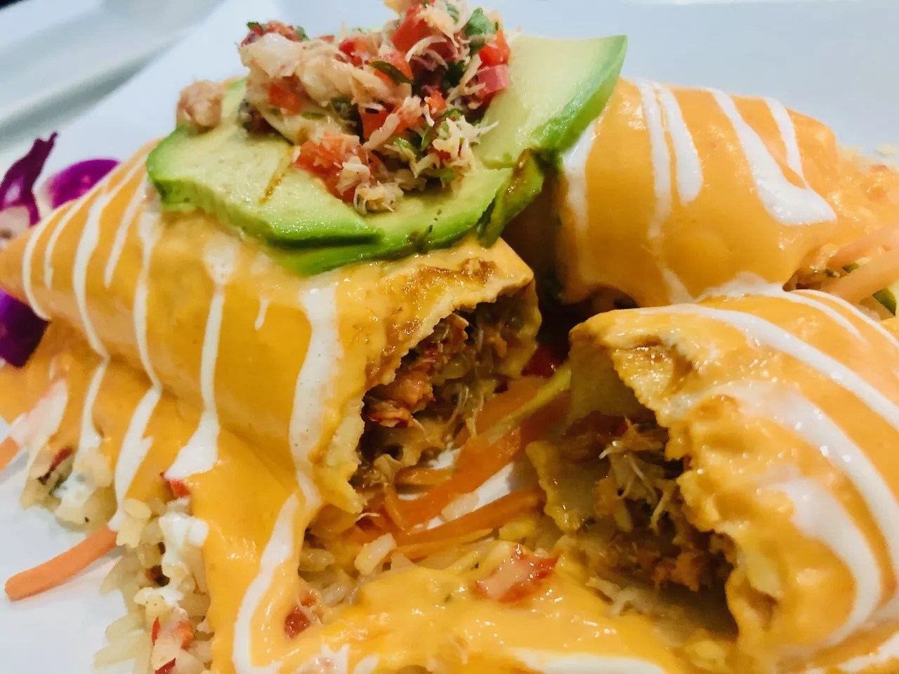 But, the point-guard on the plate is definitely the seafood, which includes lobster, blue crab and shrimp. I tasted mostly crab. There’s so much of it that the price tag of $24 for the plate seems reasonable. An extra dollop of the seafood mix sits atop the enchiladas along with a slice of avocado.