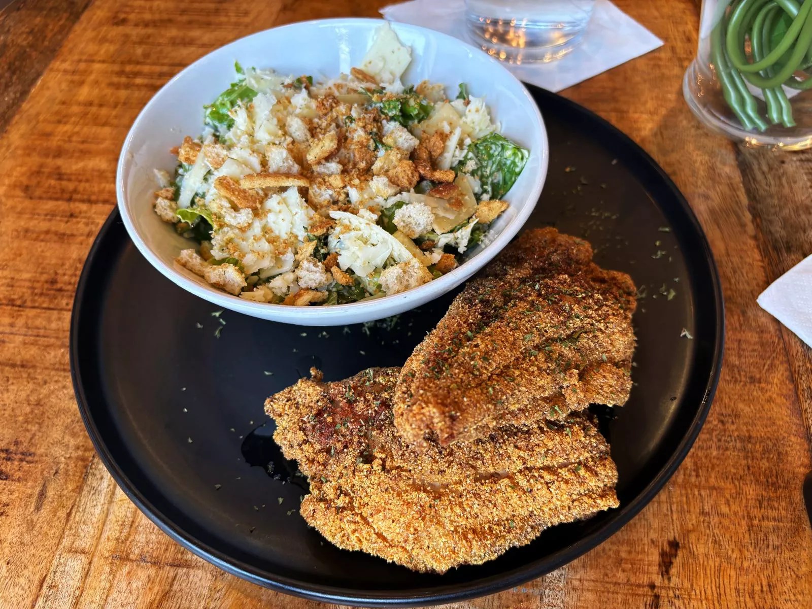 Everything except the salmon bites is under $20, and classic or no, we can get behind that. It’s a classic menu with nothing screaming avant-garde. We ordered the brisket quesadilla and the catfish filet with a Caesar salad as our choice of side.