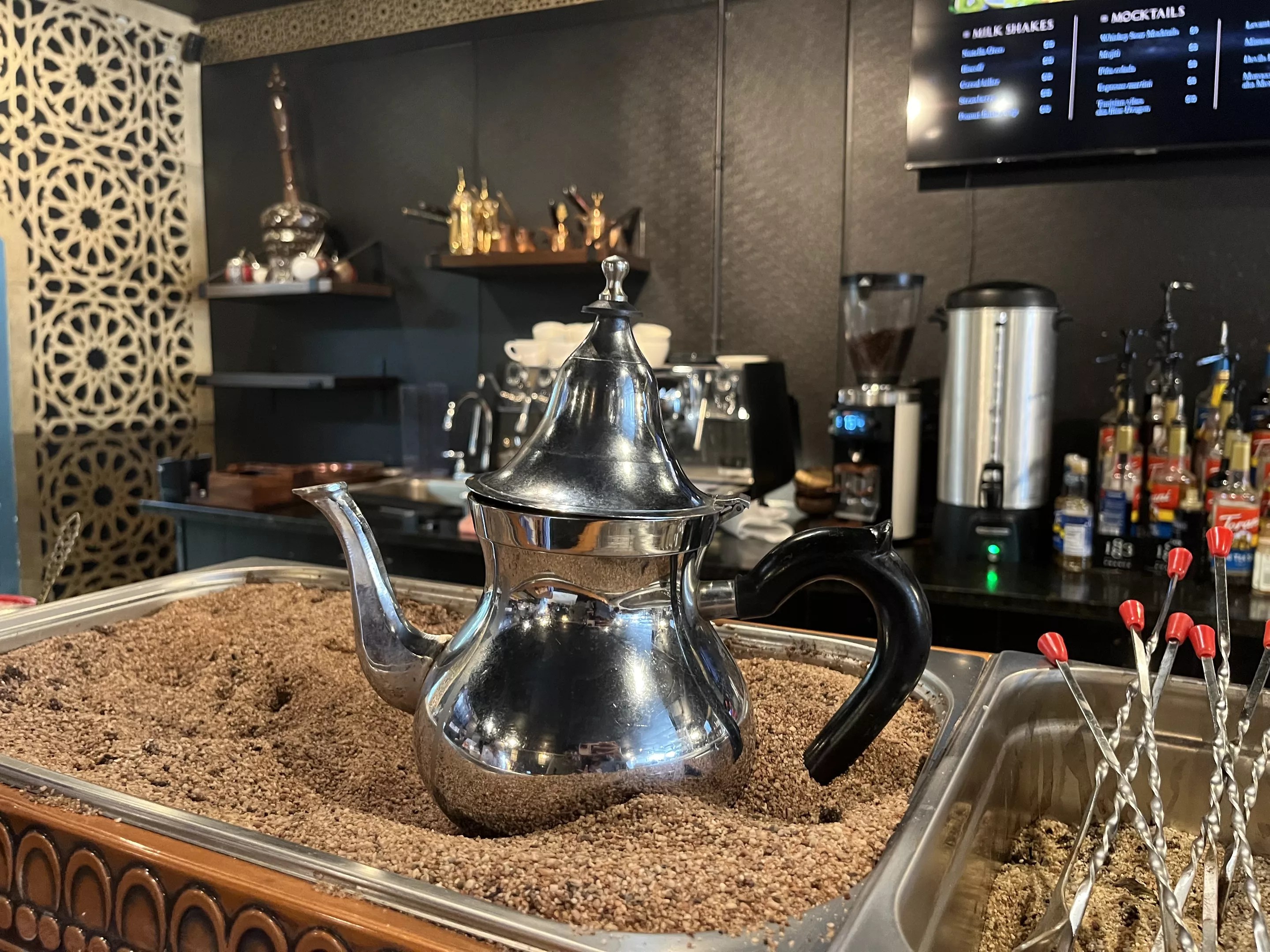 Watch your Turkish coffee being heated in a sand bath near the front counter.