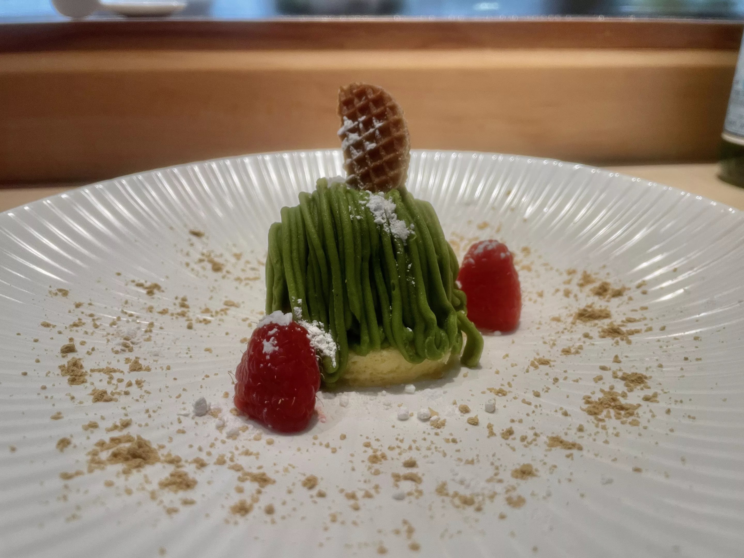 Dessert seemed to be an afterthought and wasn’t listed on the menu. However, we found that if you don’t ask, the answer is always no. Options were crepe cake or matcha cake, which is a famous Japanese dessert more formally known as “matcha mont blanc.” A small, circular sponge cake base is piled with whipped cream and finished with spaghetti-thin strands of matcha chestnut cream, raspberries and a mini stroopwafel. Typical of Japanese desserts, it’s not too sweet and just enough of a serving to curb a hankering.