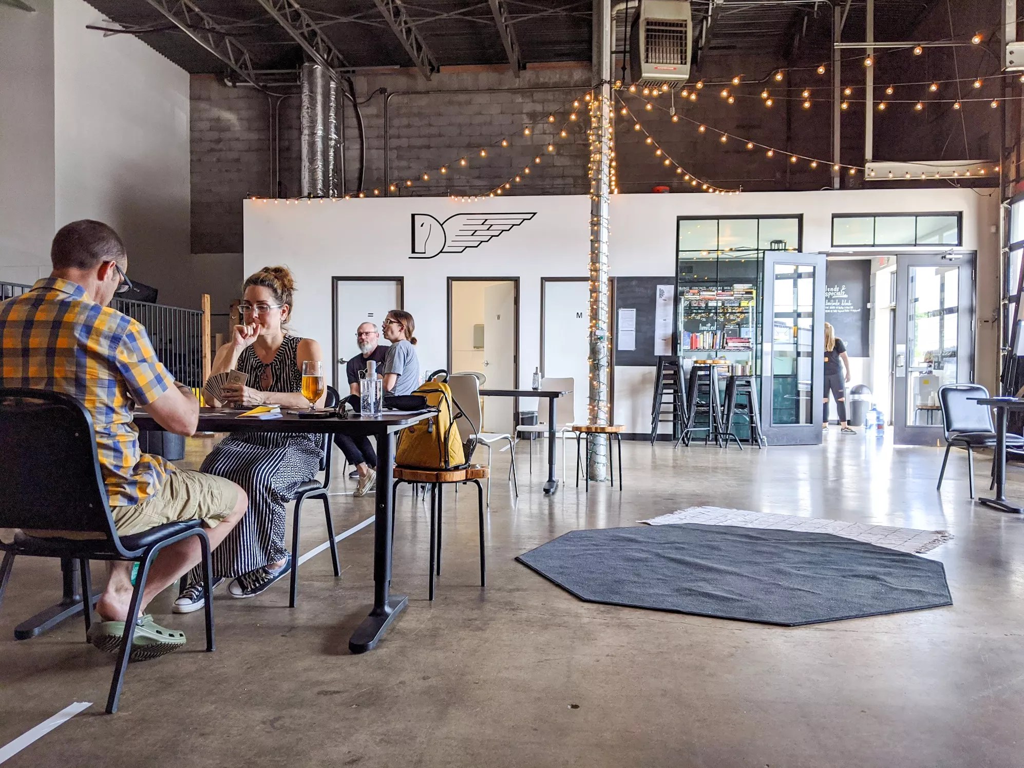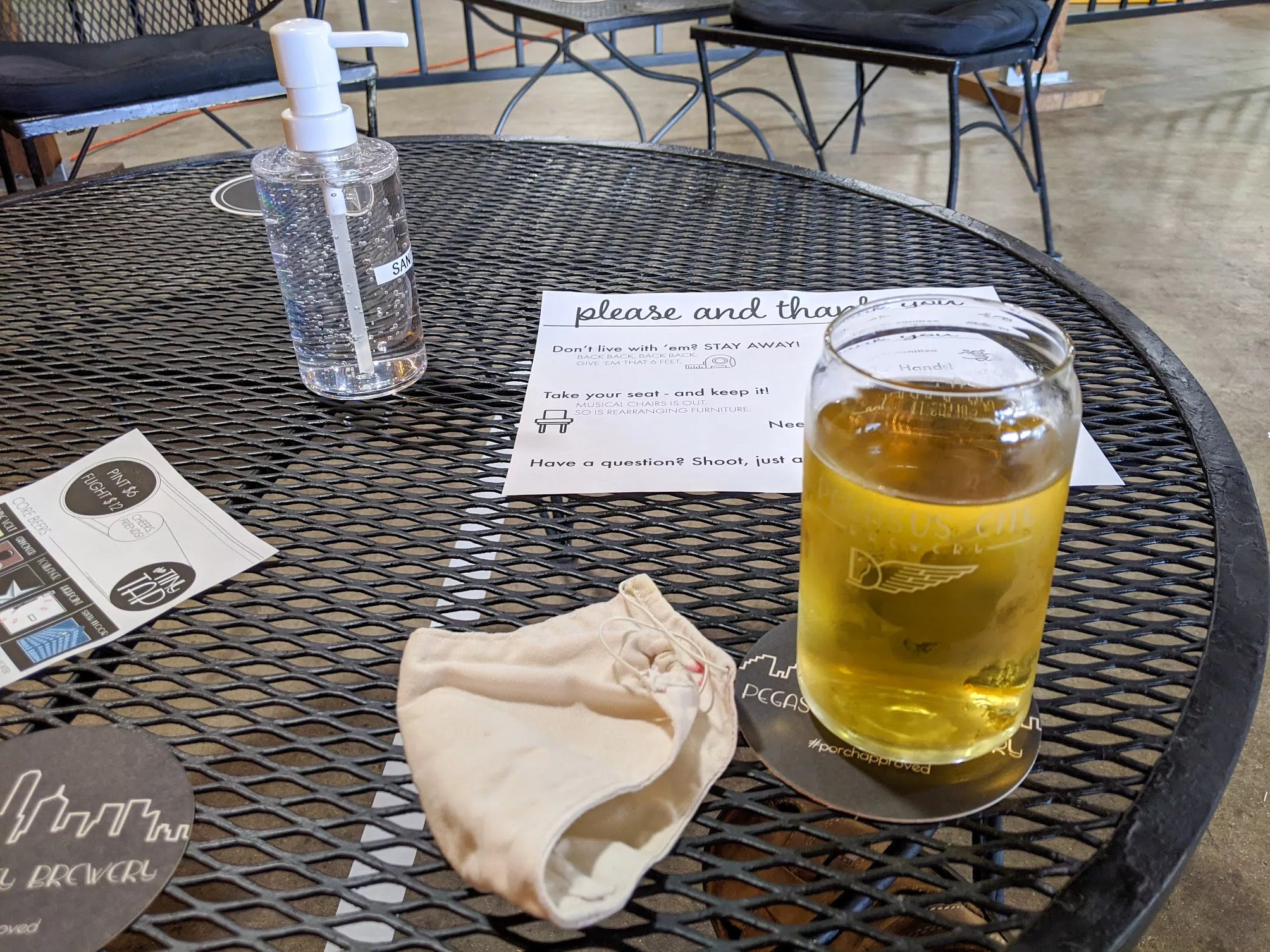 For now, patrons who want to sit inside the taproom will follow the same procedure we did: Sign up for a specific time slot, read and agree to a pre-drink text message laying down the rules, enter wearing a mask (staff members hold doors open), order at the table and only socialize with other tables from a six-foot distance. Pegasus City’s arcade games and pingpong table are off limits.