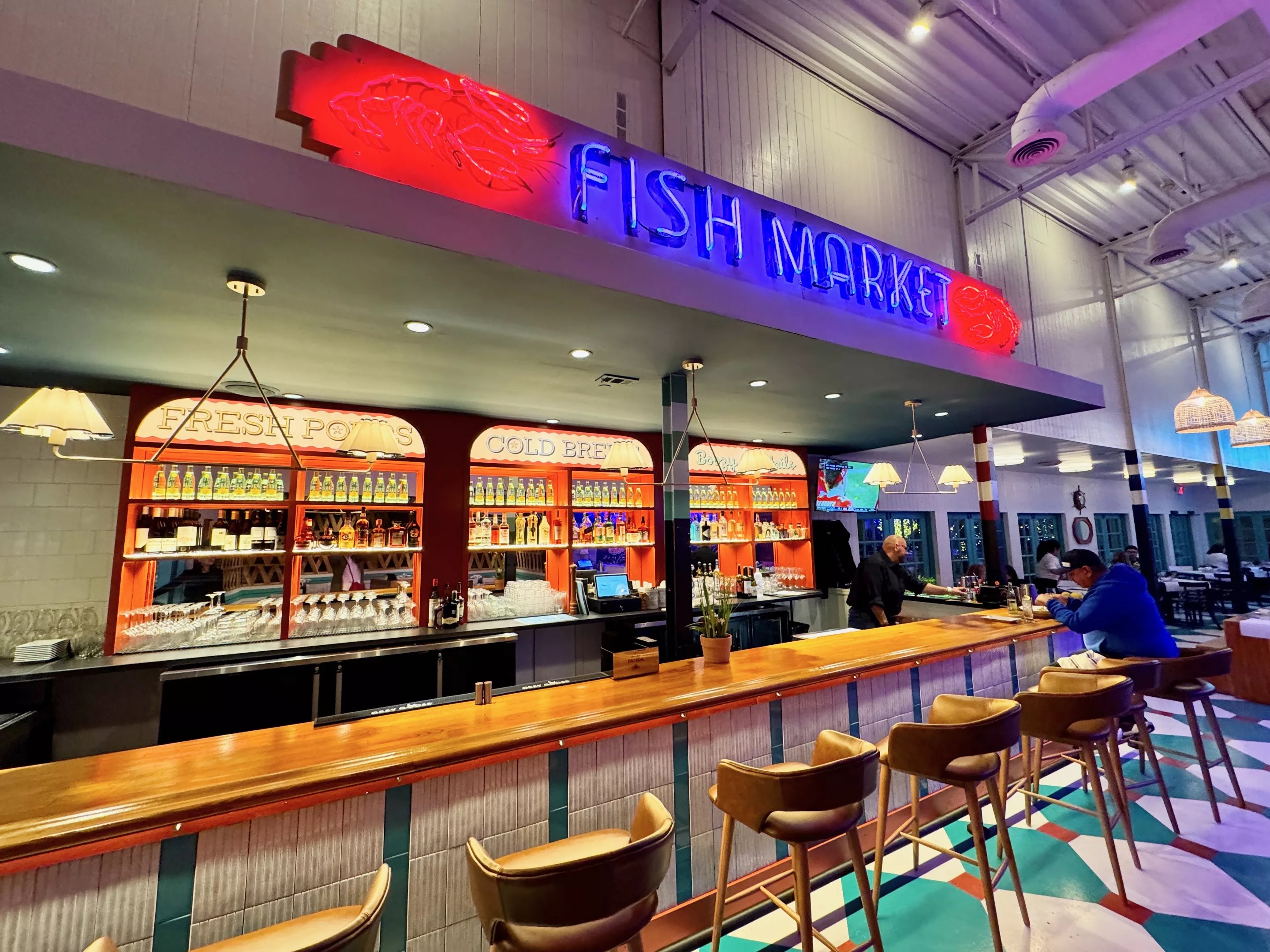 Carmona, a classically trained chef and veteran restaurateur (and always gracious host), is offering up breezy plates of seafood, coastal classics and even burgers that are upscale and casual all at once. The space is bright and cheery, with a mix of ’80s music at conversation volume. The aqua blue-and-white checkered floors lead past a soda-fountain-esque cocktail bar with one TV at the end. This leads to a long dining room with a neon marlin, crustaceans and other sea life bedazzling the walls. A wall of windows and doors let in natural light.