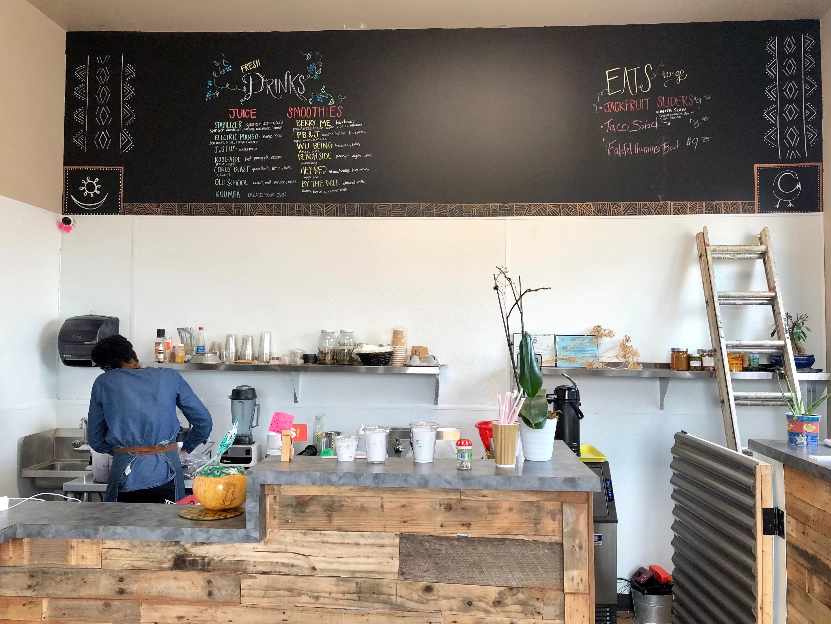 “We were told we couldn’t do a juice bar in this area,” Crear notes. But the reception has been warm. “The demographic is large. People come from the neighborhood – kids, elderly people, mommas, daddies, police. People who are vegetarians and vegans come from everywhere. I love that. We’re for everybody.”