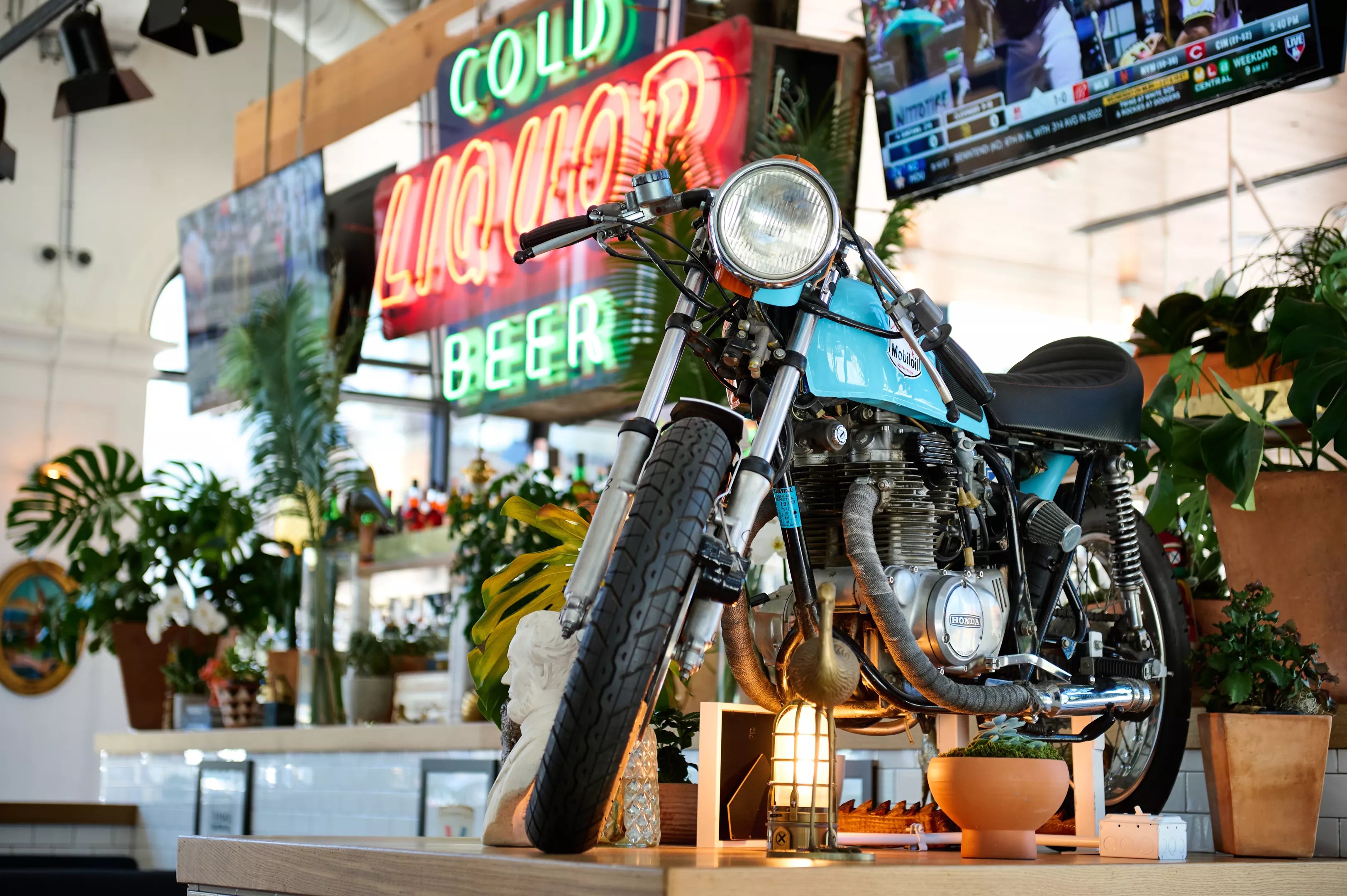 Of course there's a motorcycle. With Nick Badovinus' knack for transforming dining rooms into feasts for the eyes, we were anxious to see what was in store for National Anthem, his newest venture in Dallas' East Quarter.