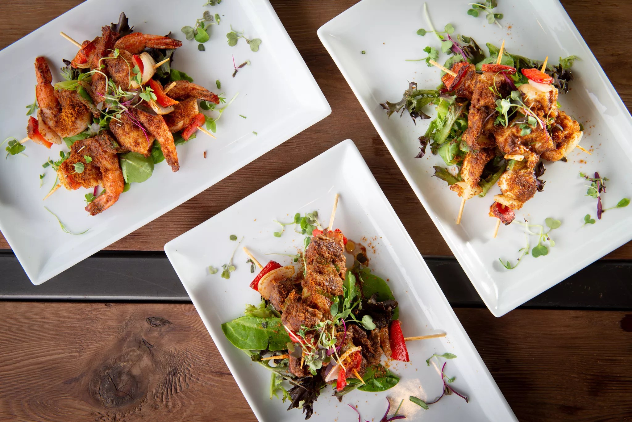 We sampled the shrimp suya ($12) and found tender shrimp on three skewers over a tiny bed of greens. The greens look like a garnish, but as spices drip off the meat and peppers, they become a tangy salad instead.