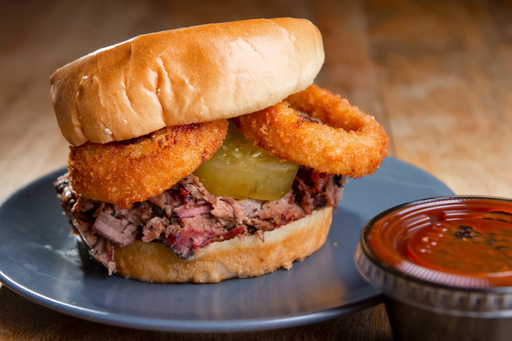 The GF sandwich: Chopped brisket, onion rings, sweet and spicy house-made pickles on a brioche bun, served with barbecue sauce