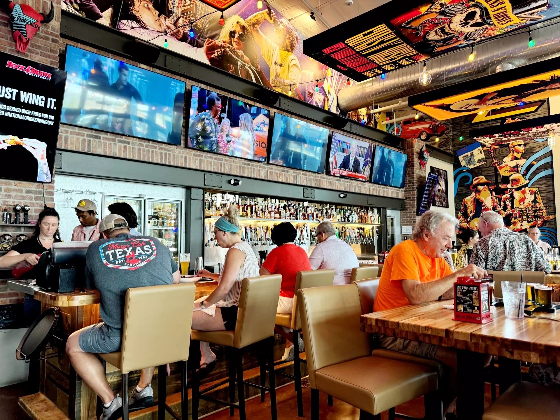 One of Rock & Brews’ most recent additions is the newly minted Grapevine location (on Highway 121, north of DFW Airport) that debuted in early July. We dropped by on a recent Sunday, and while we really had no clue what to expect (outside of the rock ‘n’ roll theme), for some reason, it failed to cross our mind that Rock & Brews might be packed wall to wall. Well, it was. There was a 30- to 40-minute wait on a Sunday at 2 p.m., so early returns on business at this location appear strong. And this is a sizable space with ample seating.
