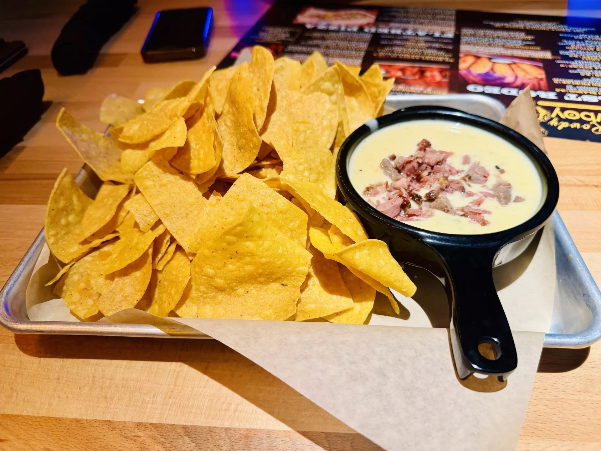 Chips and queso blanco (with brisket and hatch peppers).