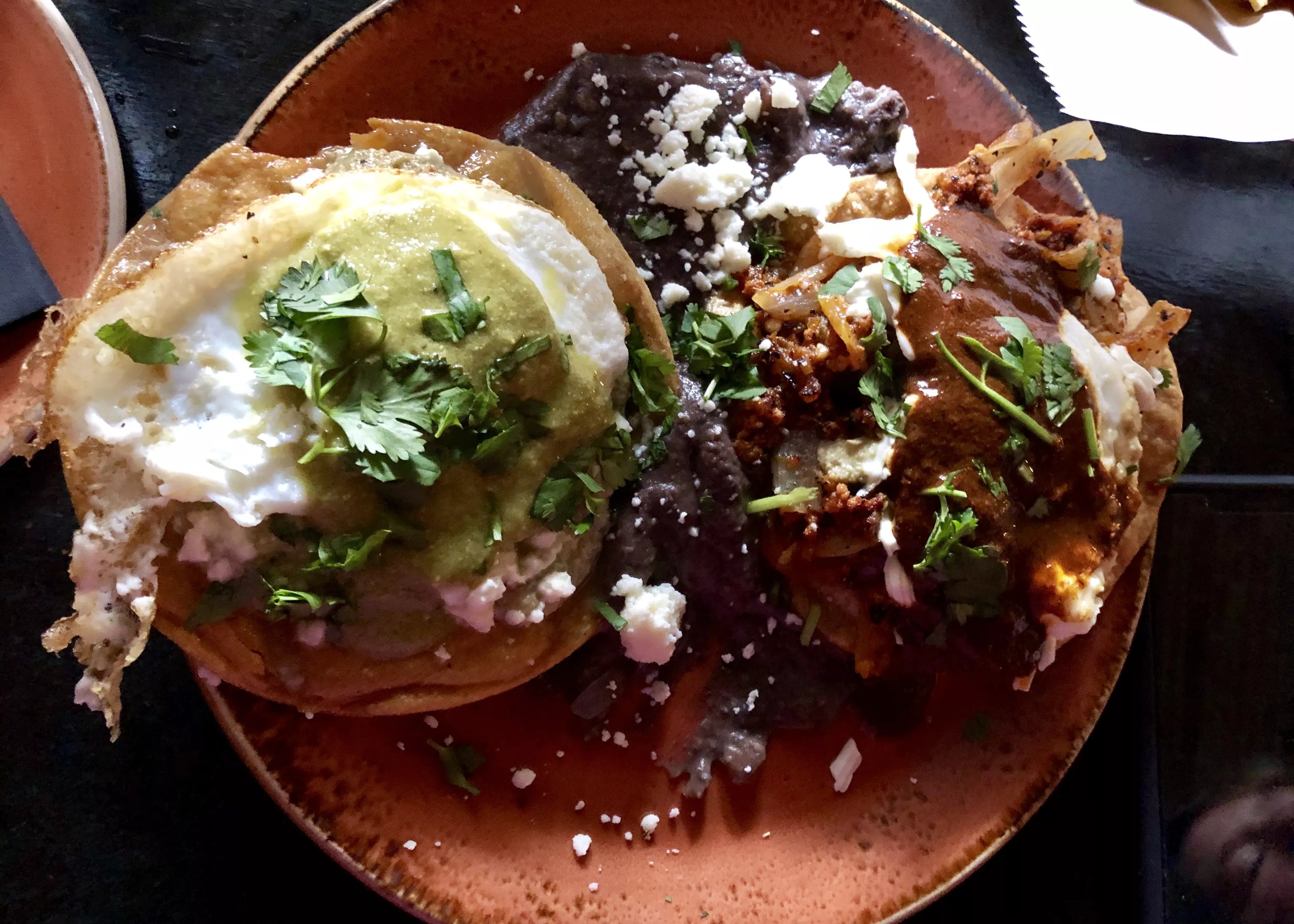 The desayuno menu looks promising. My vieja y yo ($10) tostada dish was the sharpest dish at the table. Two tostadas come to a plate: one with a roasted chayote and pumpkin seed puree, queso fresco, cilantro, over-medium egg and mole verde, the other with roasted tomato and onion salsa sprinkled with chorizo and queso Oaxaca, also served with an over-medium egg and with mole rojo.
