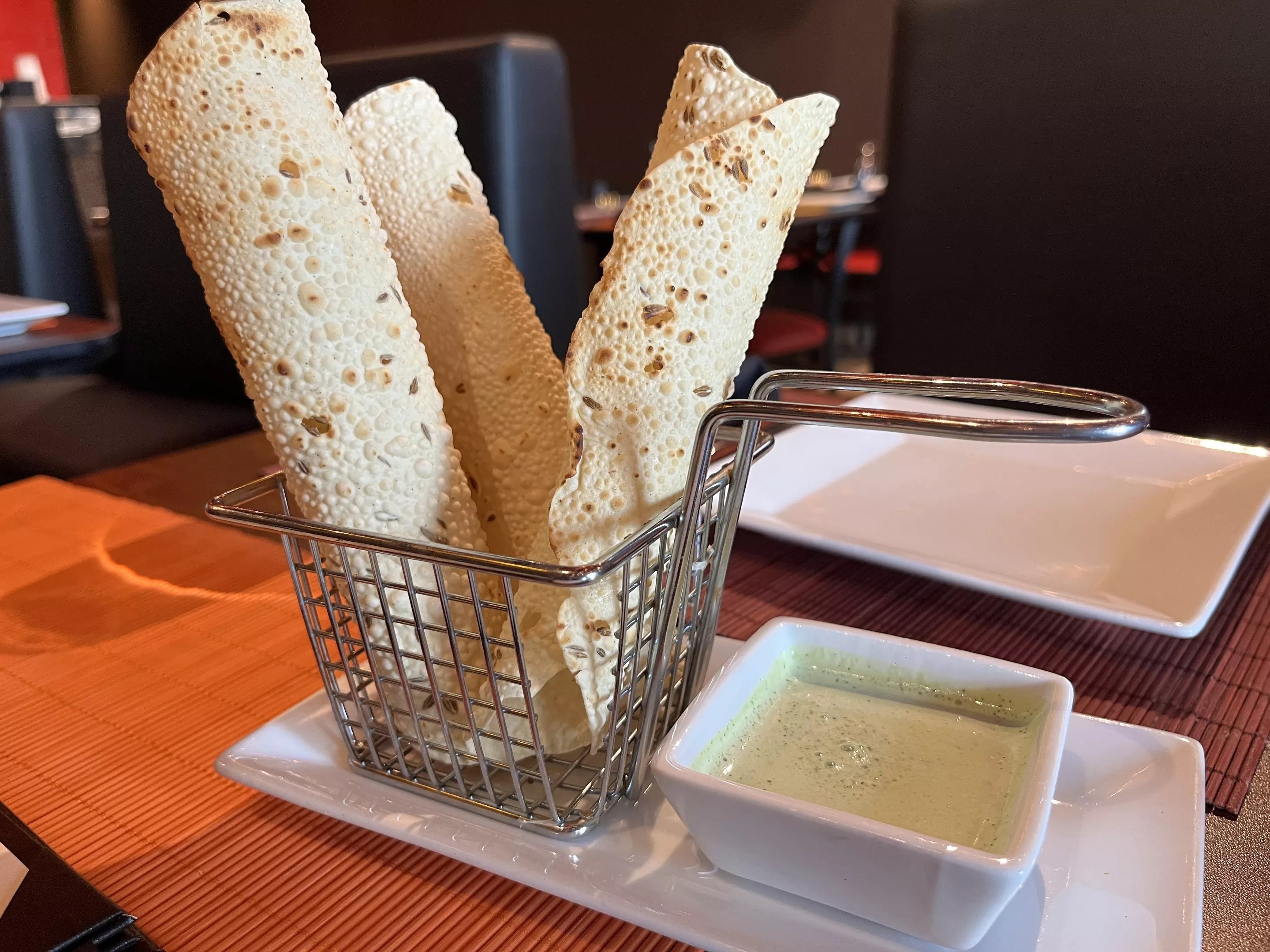 A complimentary plate of papadum is brought to your table as soon as you’re seated.
