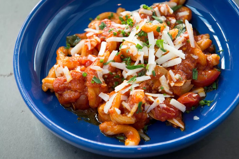 The gemelli arrabbiata () features fresh, perfectly al dente gemelli noodles.