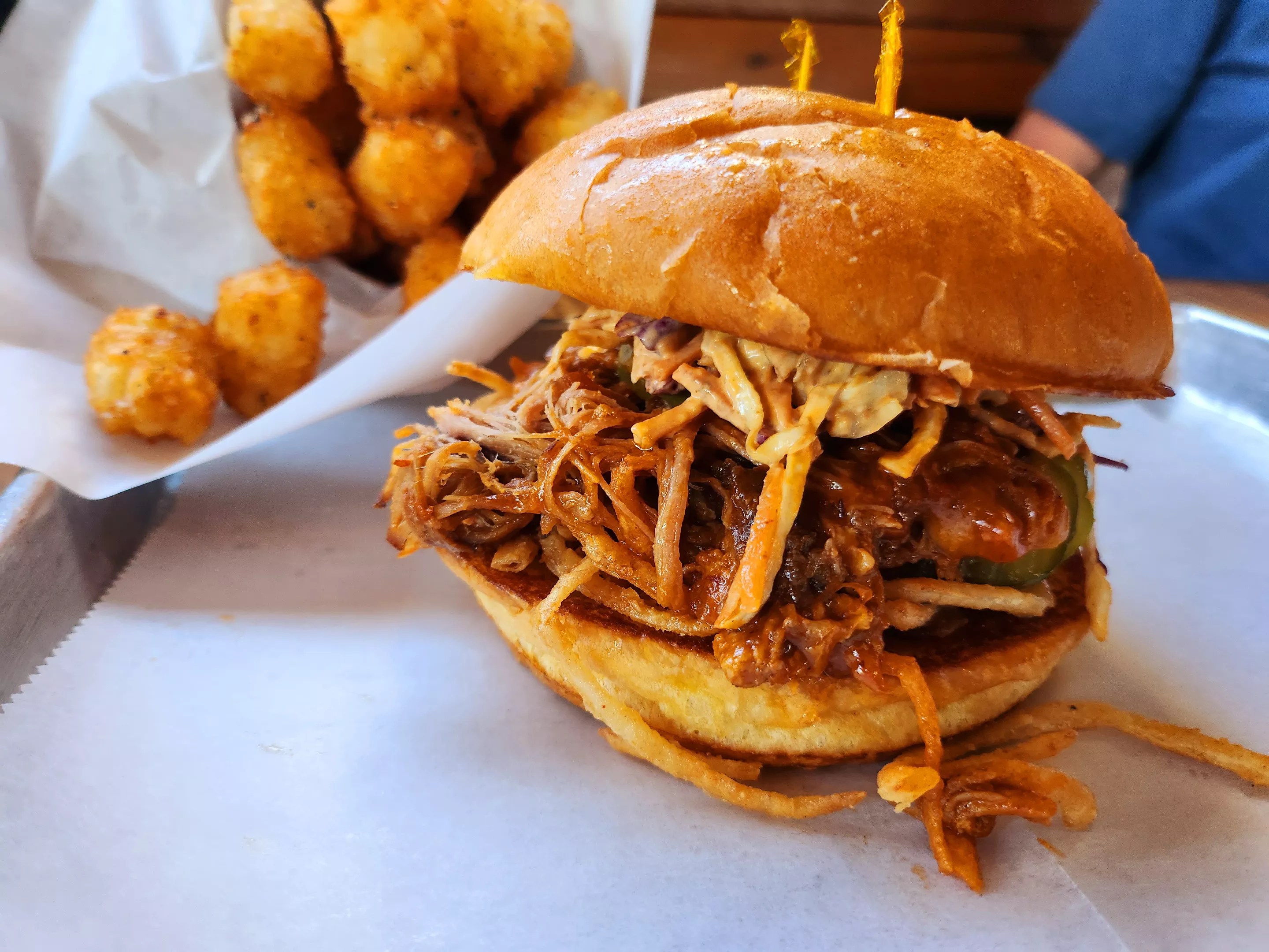 Most of the menu at Shady’s is made in-house, down to the buns, which glisten as though they were modeling for a foodie photoshoot. The beef patties were high quality, nicely sized and cooked just right. The service was also stellar (shoutout to our server whose nickname was “Shakemaster”; we see you). Shady’s even accommodated a special request, an off-menu item that took the ingredients from the pulled pork taco and put it into a sandwich – which looked awesome, by the way.