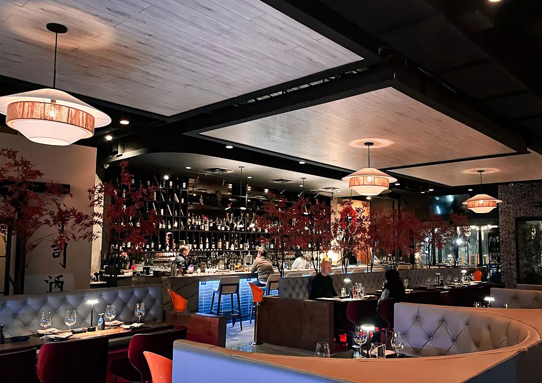 The decor is a nod to many ancient cultural references. Two samurai guard the patio. A Buddha-themed omakase room is tucked away in the back. Japanese maple trees line the booths. Light fixtures overhead appear to be topped with traditional Japanese hats. Even the artwork in the bathroom is curated. Every corner is undeniably zen and sleek.