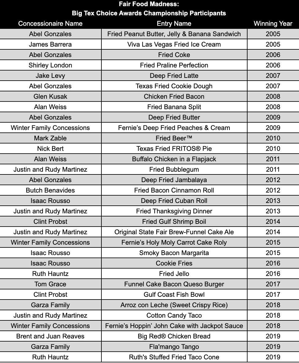 This is the 15th year for the championship, which brings out the zany, fried creations we’re all used to smelling at Fair Park in September and October. This year, the showdown brings together the previous winners to have the best come out on top.
