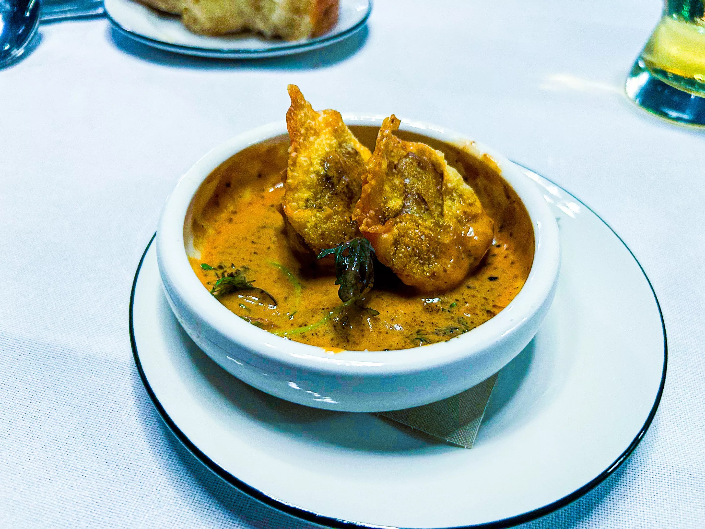 Dinner starts with a crab croquette and loaf of bread.