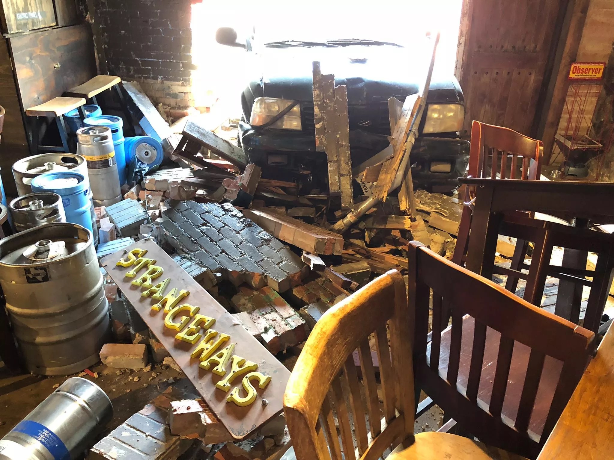 “They couldn’t wait for us to open,” Strangeways owners joked on Facebook when posting a photo of the Oldsmobile Bravada that crashed through the wall and into the bar around 3:30 p.m. Sunday.