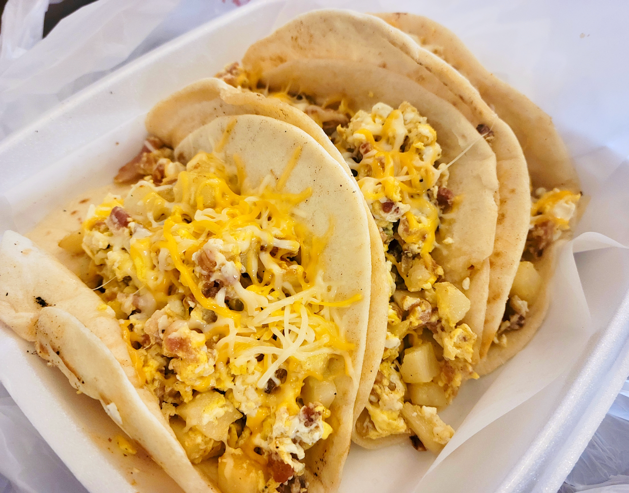 When the breakfast tacos came out, I had to confirm we had ordered the tacos and not the burritos because these were huge. We got ours on flour tortillas and decided to save the corn for our other tacos. Each taco was gleefully packed with fluffy eggs, gooey cheese and a variety of savory minced meats. It might depend on your metabolism, but this massive breakfast wrap can easily have you skipping the rest of your meals for the day.