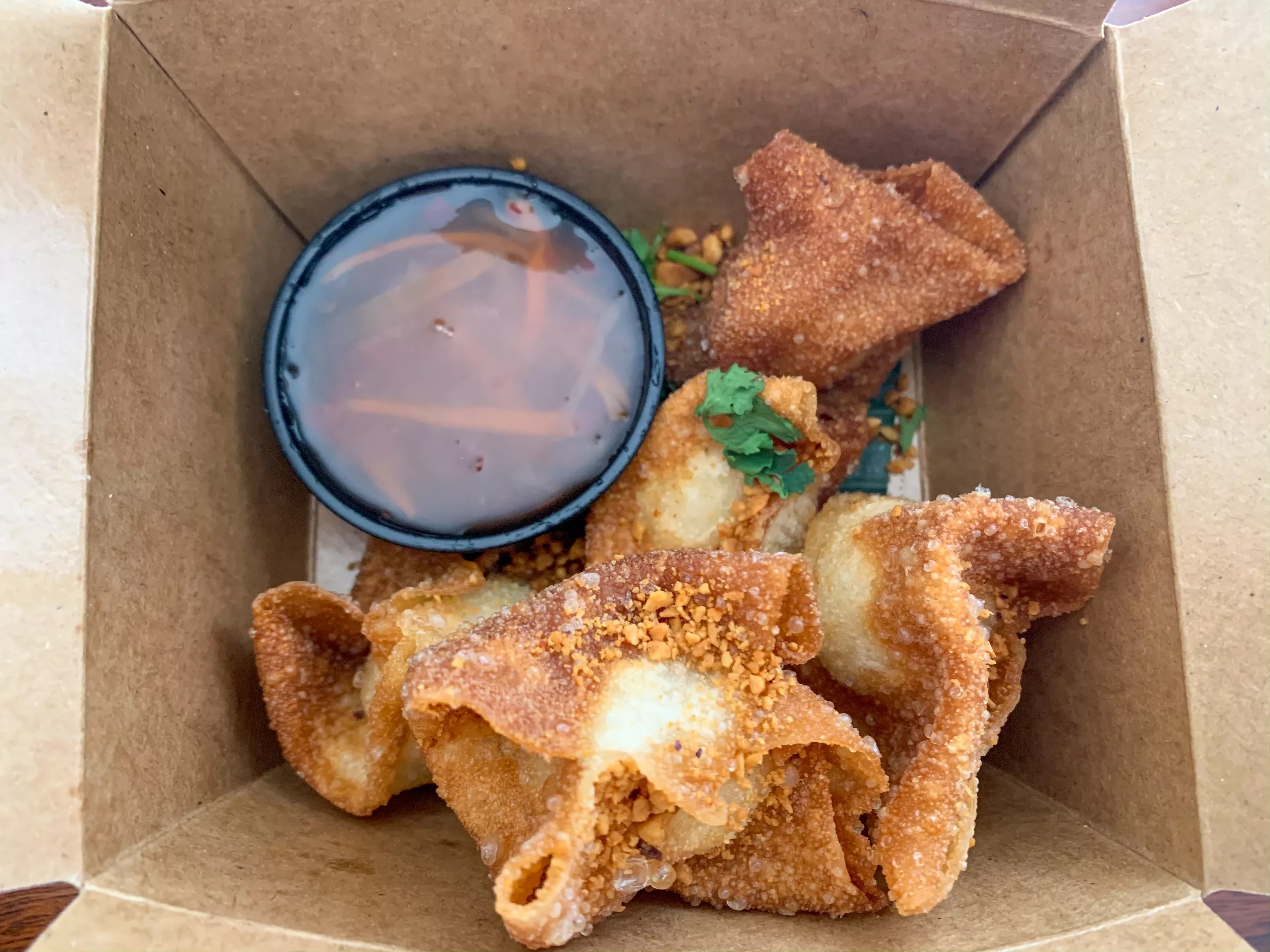 Taking it home from downtown in about 10 minutes was fine – even the perfectly cooked quail eggs that rested inside crisp, fried wonton wrappers for dipping in a sweet and just-spicy sauce. The gyao grob should be at least one appetizer you order with your meal ($5 for five).