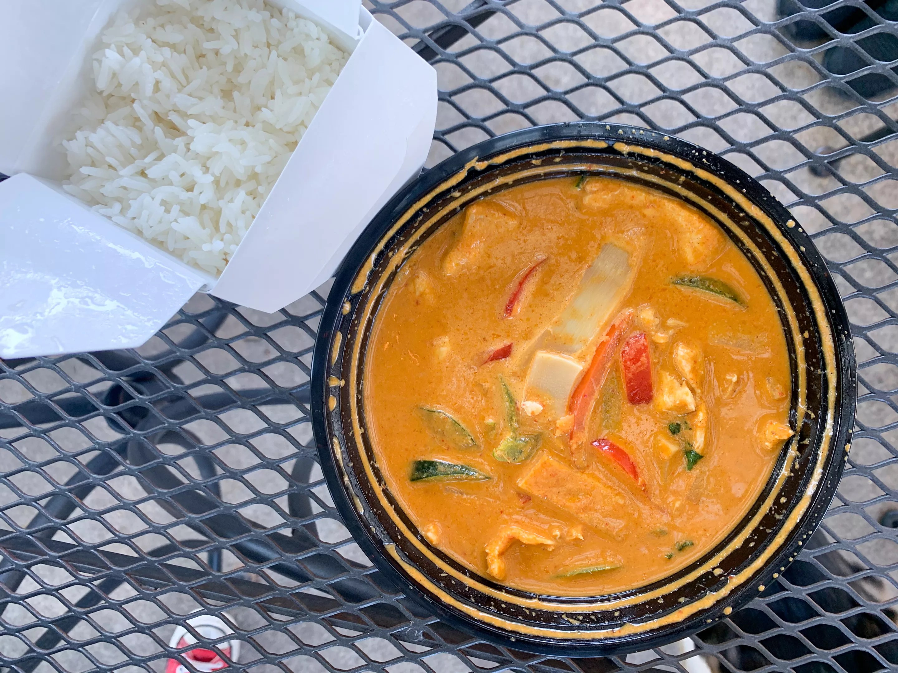 So, if you wanted to grab an order of those and a cup of tom-kha-gai, the coconut-milk soup here is a bit of a sweet treat ($6) and keep your entire order of curry for a future day. At the very least, that’s investing in a future workday, yet another one at your home office.