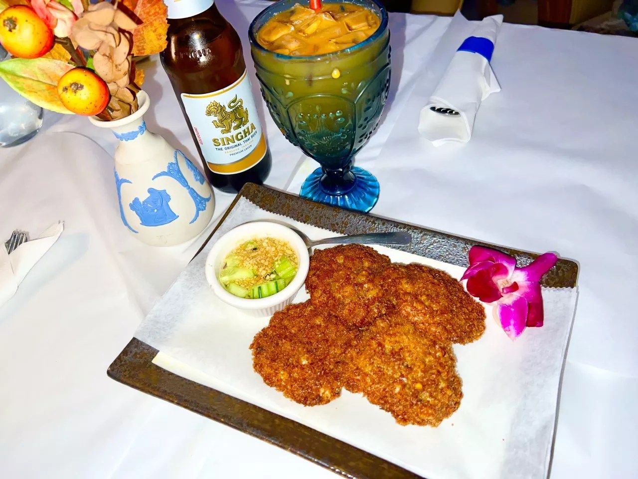 We were first to arrive for dinner, though it didn’t take long for the dining room to get busy. How about a bottle of Singha, an all-barley Thai malt to start with? Yes, please. If you’re not in the mood for a brew, consider the Thai iced tea, a black tea with cream, sugar and spices. So good.