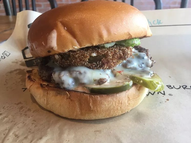 This custom-built burger at Dugg features fried green tomatoes.