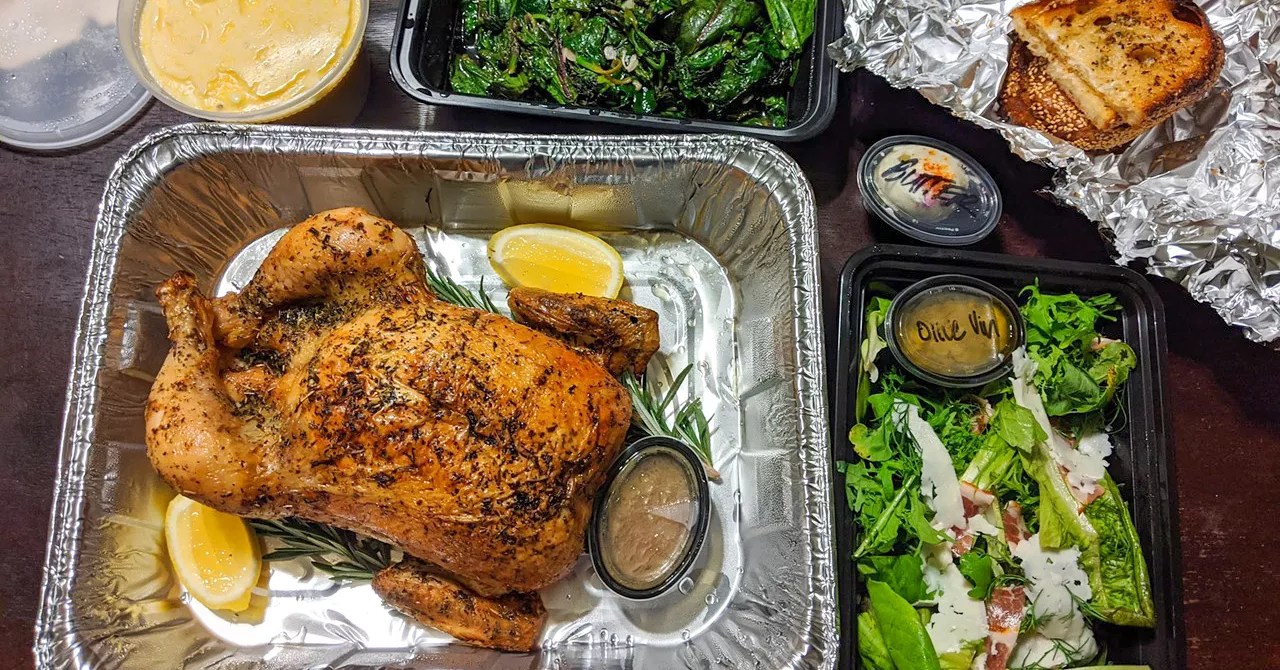 Homewood’s roasted chicken dinner for two with wilted greens, salad, garlic sourdough, cheesy grits and strawberry shortcake.