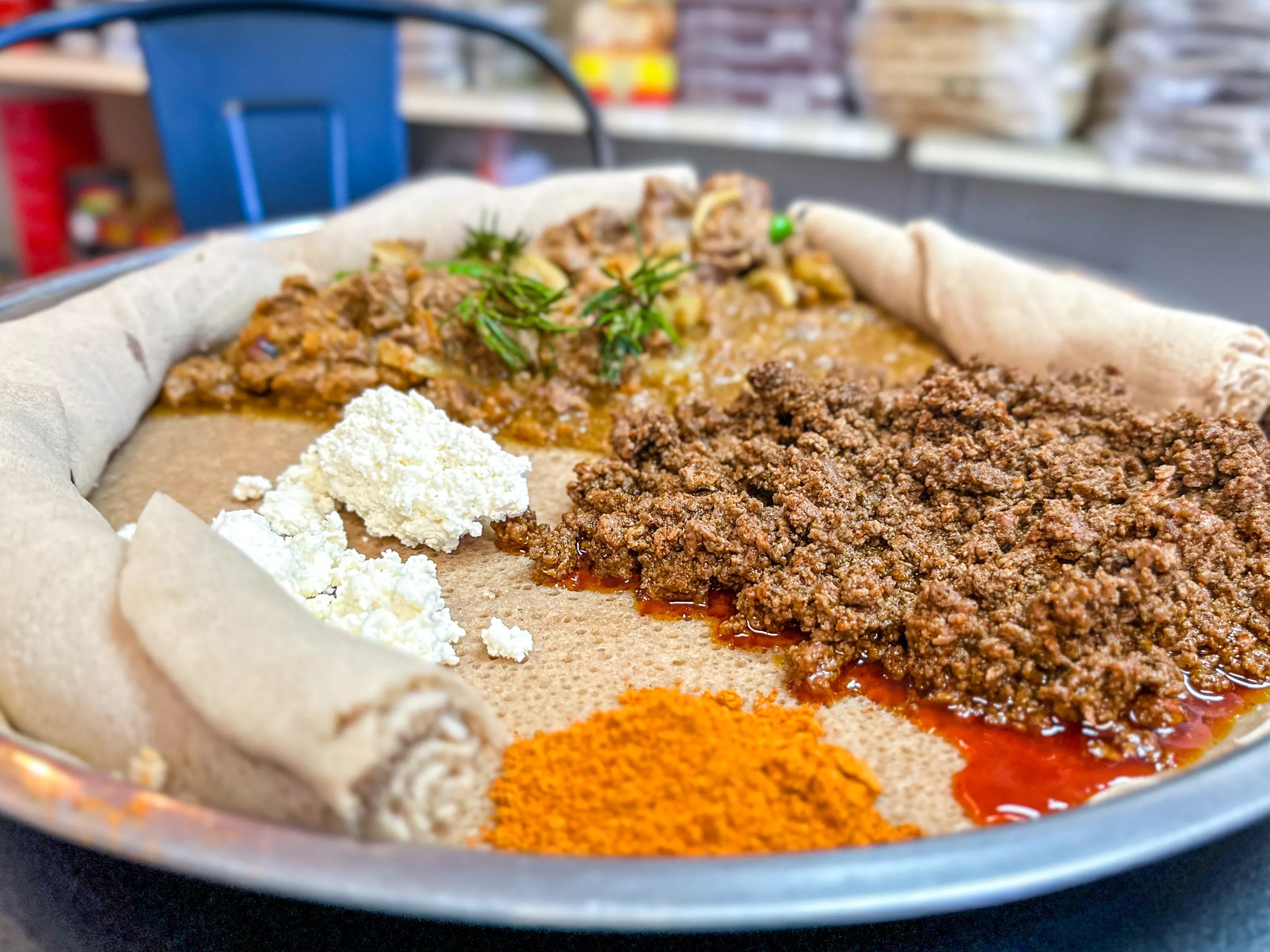 Lamb tibse and beef kitfo along with the injera flatbread that is used as the eating utensil at Agoza Kitchen.