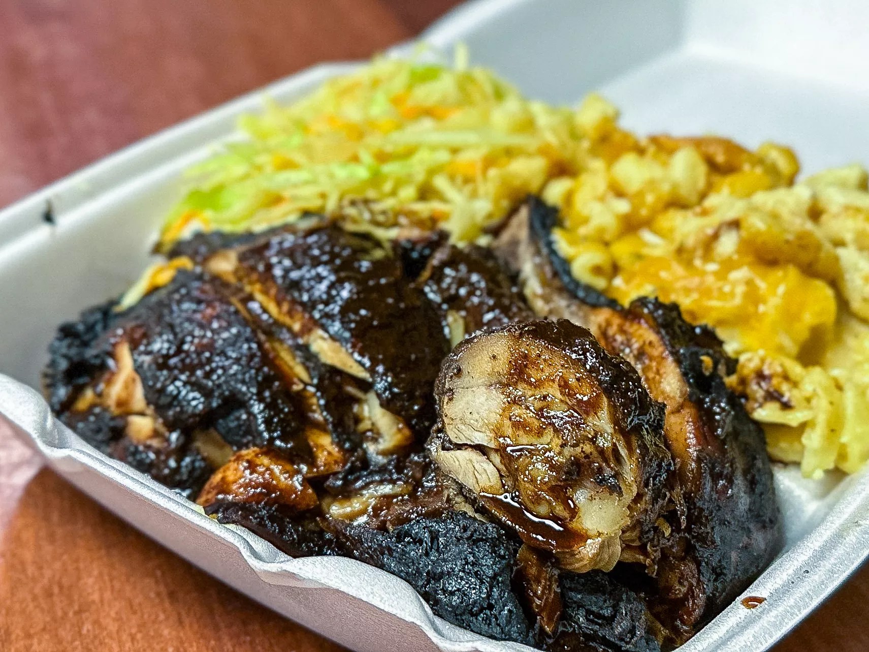 Reggae Wings & Tings serves up a large portion of jerk chicken along with some cabbage and mac ‘n cheese that won’t disappoint.