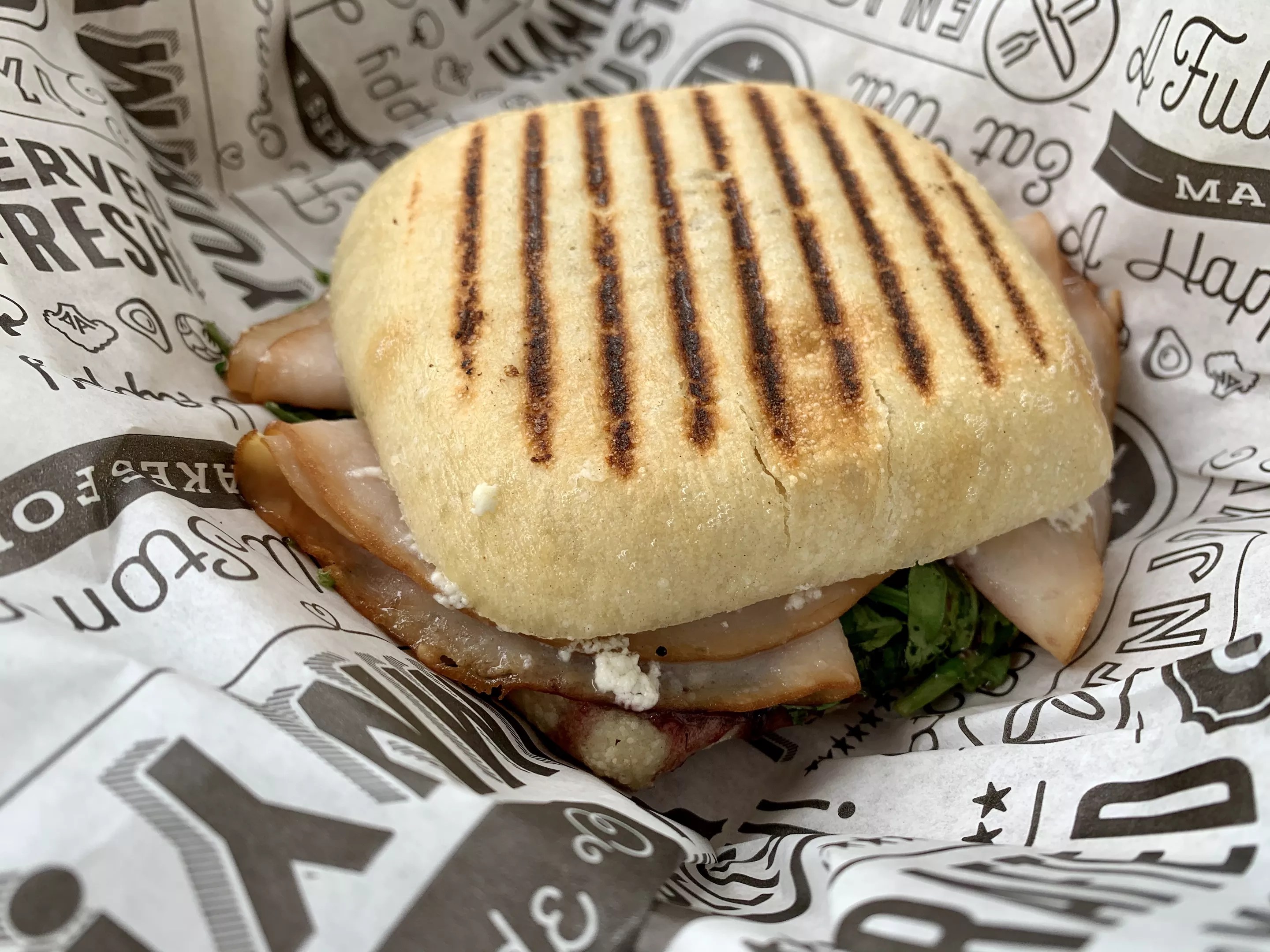 The main thing holding back the sandwich wasn’t the swapped protein, but the blackberry preserves smashed into the bottom piece of bread. One way to ruin a dining experience: make food one handles soggy from the base. But the flavors worked just fine. The mayo is, indeed, heavy with herbs, making the pairing with the sweet blackberry somewhat odd, but the tang of goat cheese somehow brings everything together well enough.