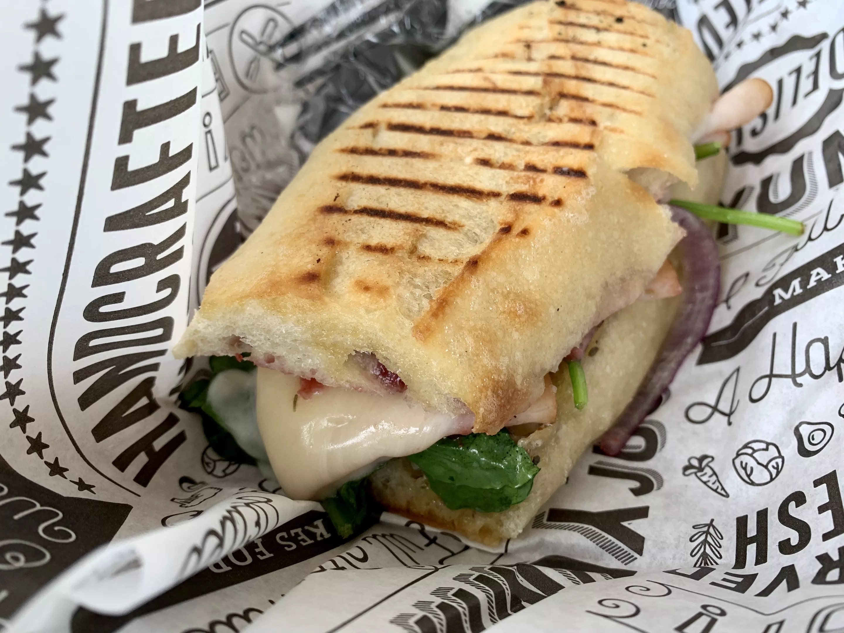 The Gutenberg is better, with turkey breast, provolone cheese, cranberry preserves, red onion, spinach and more herb mayo on a toasted baguette ($12). This was a superior option, loaded with cheese on a slightly better form of bread.