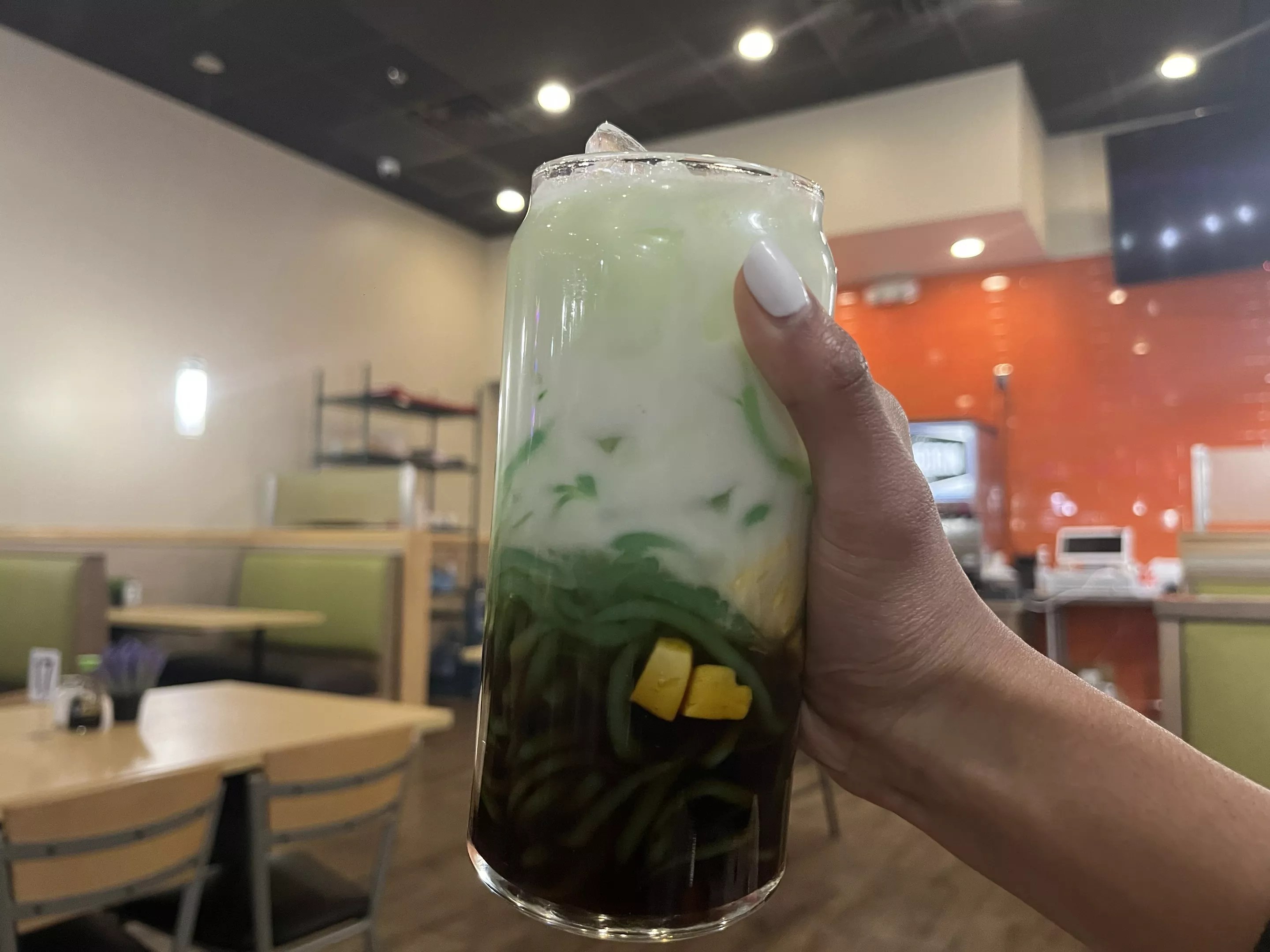 Cendol, a typical Malaysian drink, comes with tapioca noodles submerged in sweetened coconut milk.