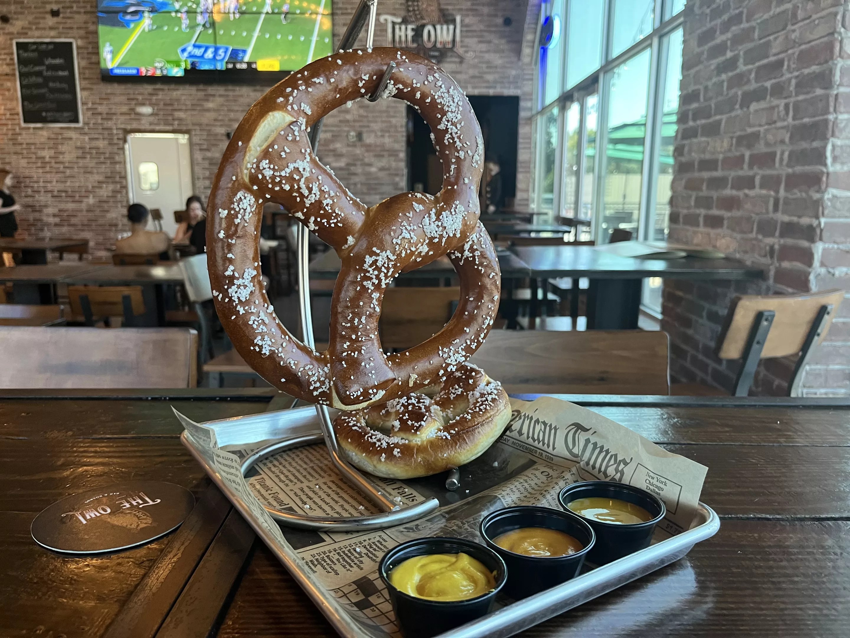 Pizzas are thin-crusted enough to be considered light, but big enough to satiate the appetite. Drinks lead well into the screech pizza – decorated in pepperoni and a hot sauce drizzle – or perhaps an Owl Pacino, dressed in fig jam, prosciutto and goat cheese. Priced between $17 and $20, the pizzas are complemented by giant boards of artisan pretzels and dips. Munch on the Bavarian pretzel that’s about the size of a human head, served hanging over an array of three mustards. Order a Bavarian pretzel, served with three different types of mustard. Anisha Holla