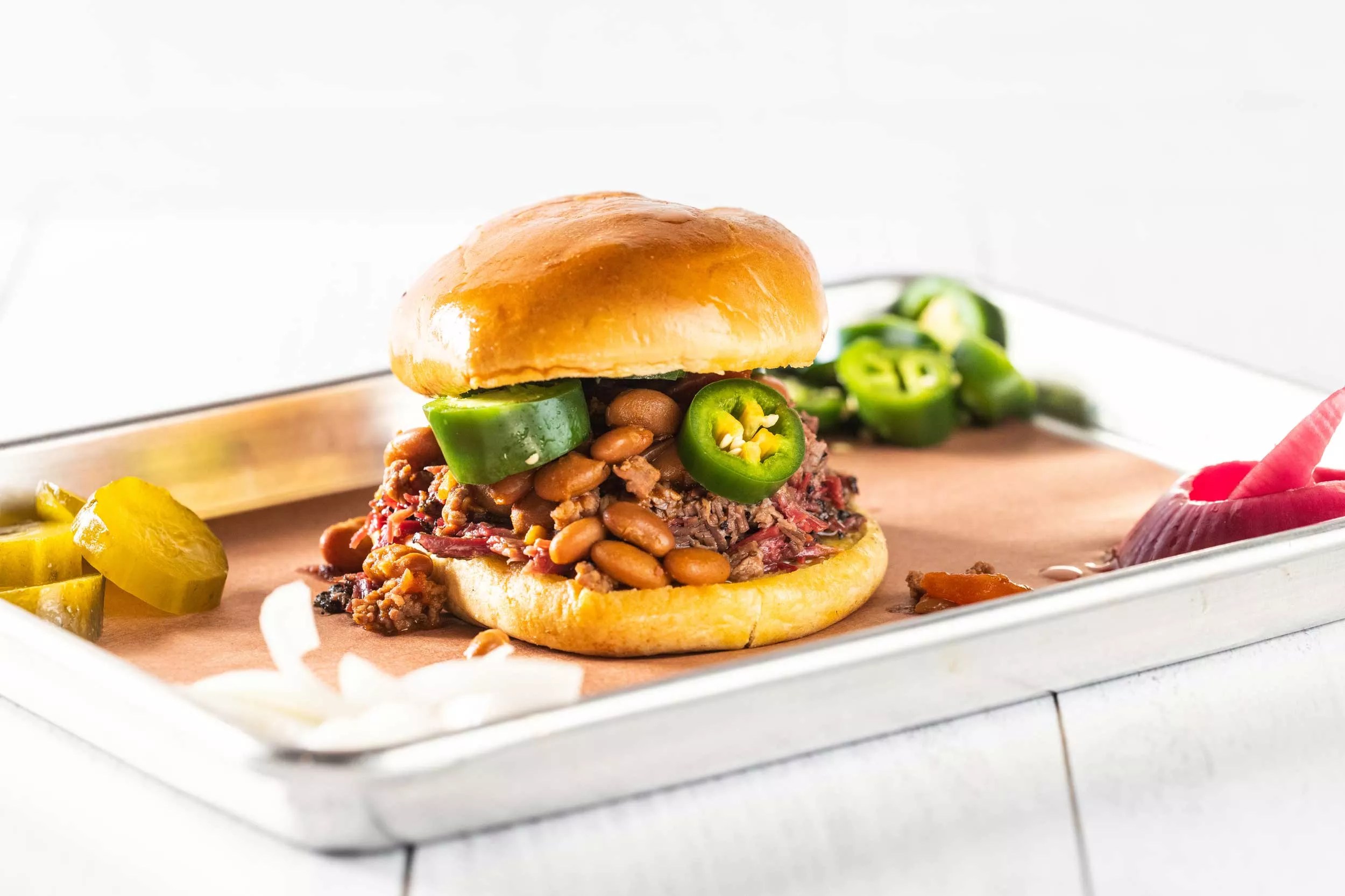 The Jabo sandwich from Smokey Joe’s: chopped brisket, baked beans topped with jalapeños