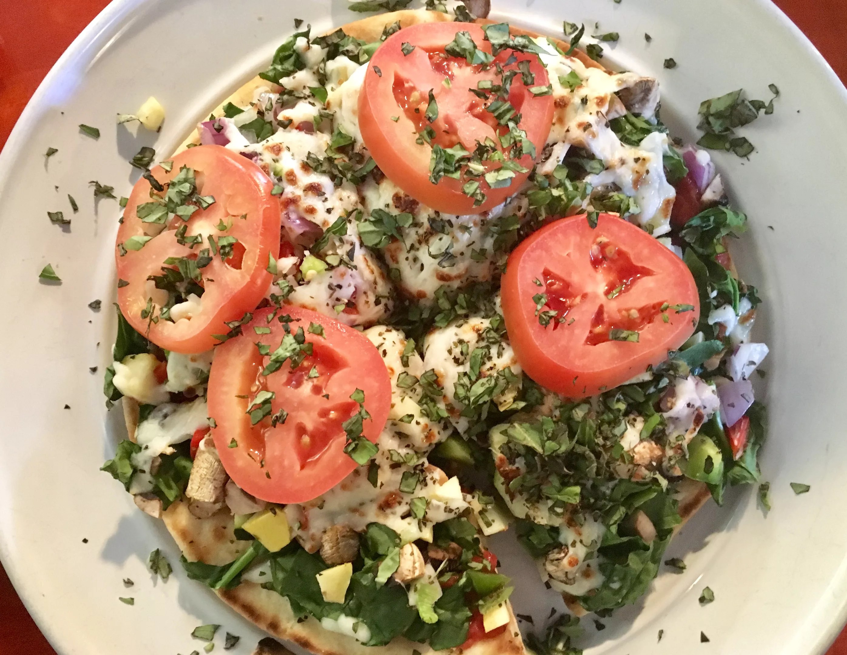 The Mandala Pizza with spinach, zucchini, mushrooms, bell peppers and mozzarella on naan bread is .45.