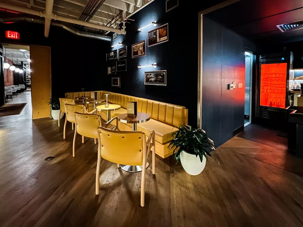 Seating the color of butternut squash pops against navy blue walls, giving Tina’s Continental a cozy, mid-mod vibe.