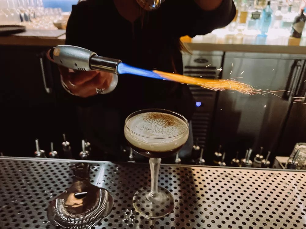 Espresso martinins come with a free light show, thanks to cinnamon toasted via blowtorch as a garnish.