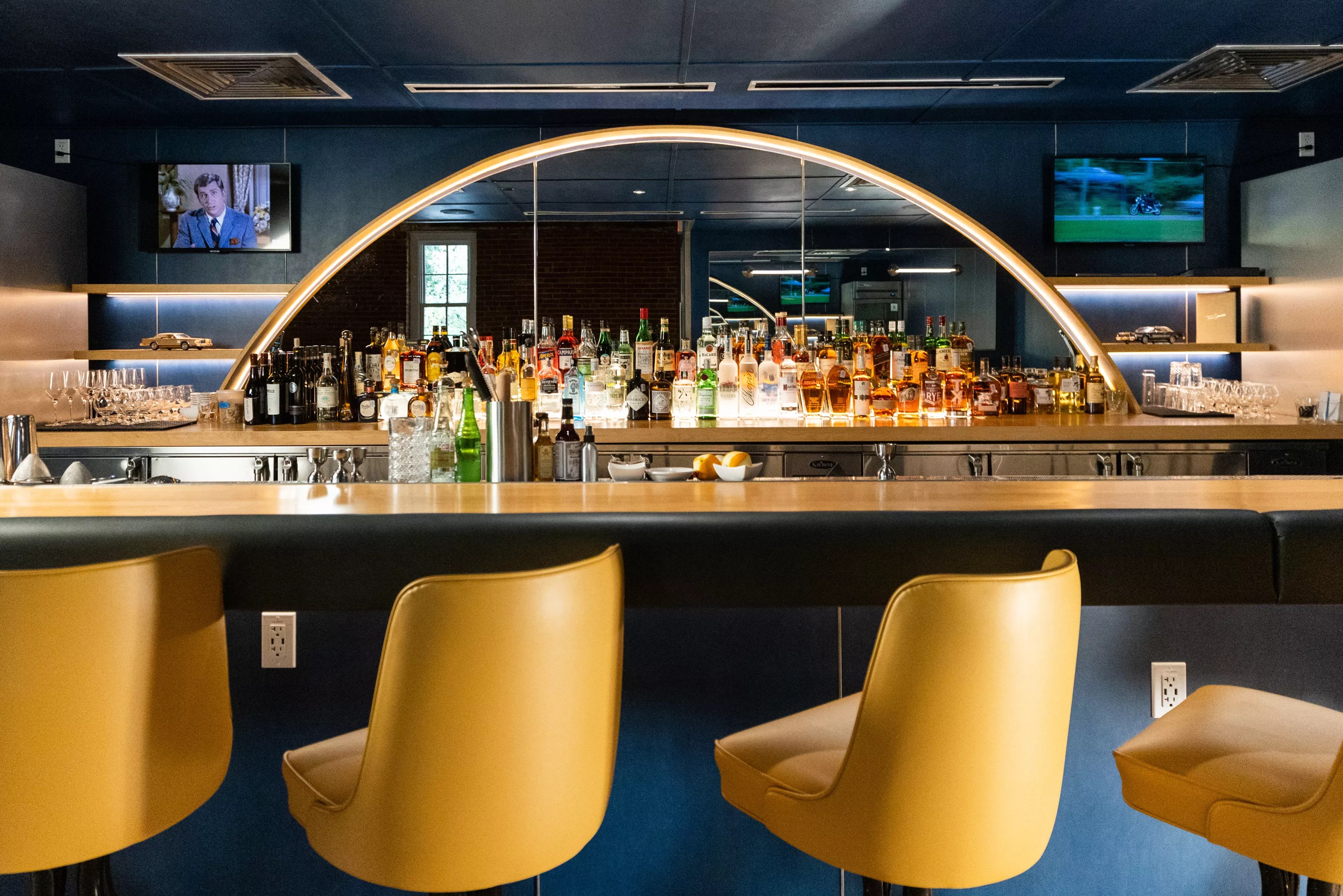 Inside the bar’s mere 800-square-foot space, the dark denim blue walls, pale yellow chairs and photos were all taken from Bill Blass’ Edition of the car released in 1977.