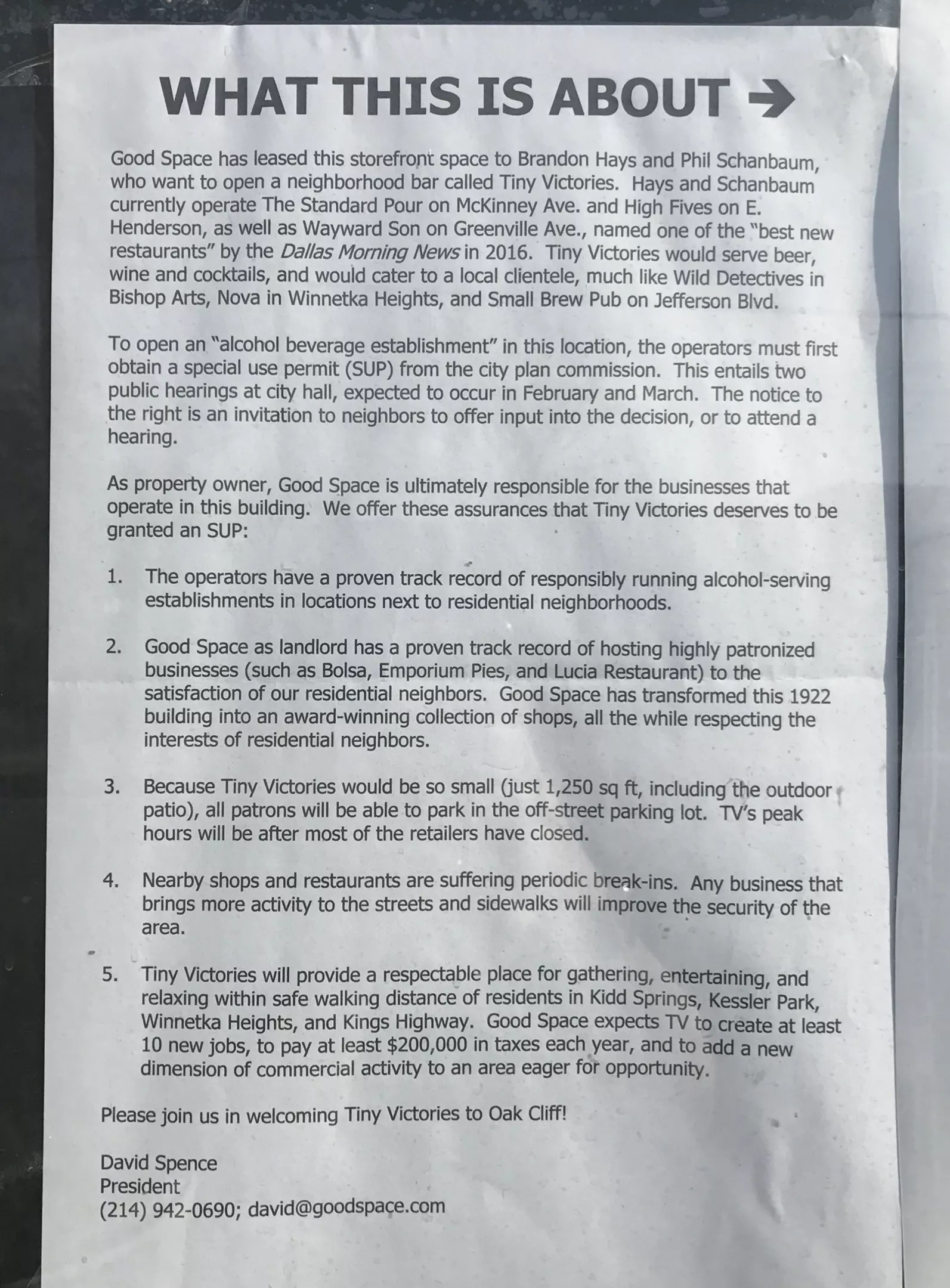 Taped on the window next to the “Proposed rezoning” sign on the future potential bar is an amicable letter from David Spence – who renovated the space and leases it out – discussing the owners, the size of the space (1,250 square feet, including the outdoor patio) and how “Tiny Victories will provide a respectable place for gathering, entertaining and relaxing.”